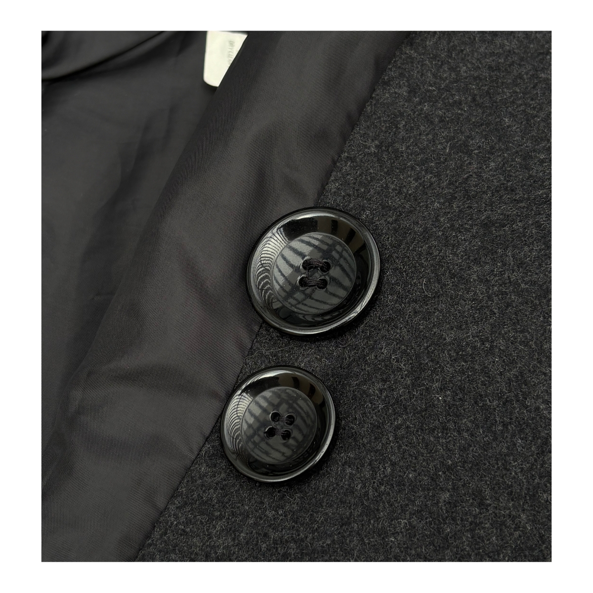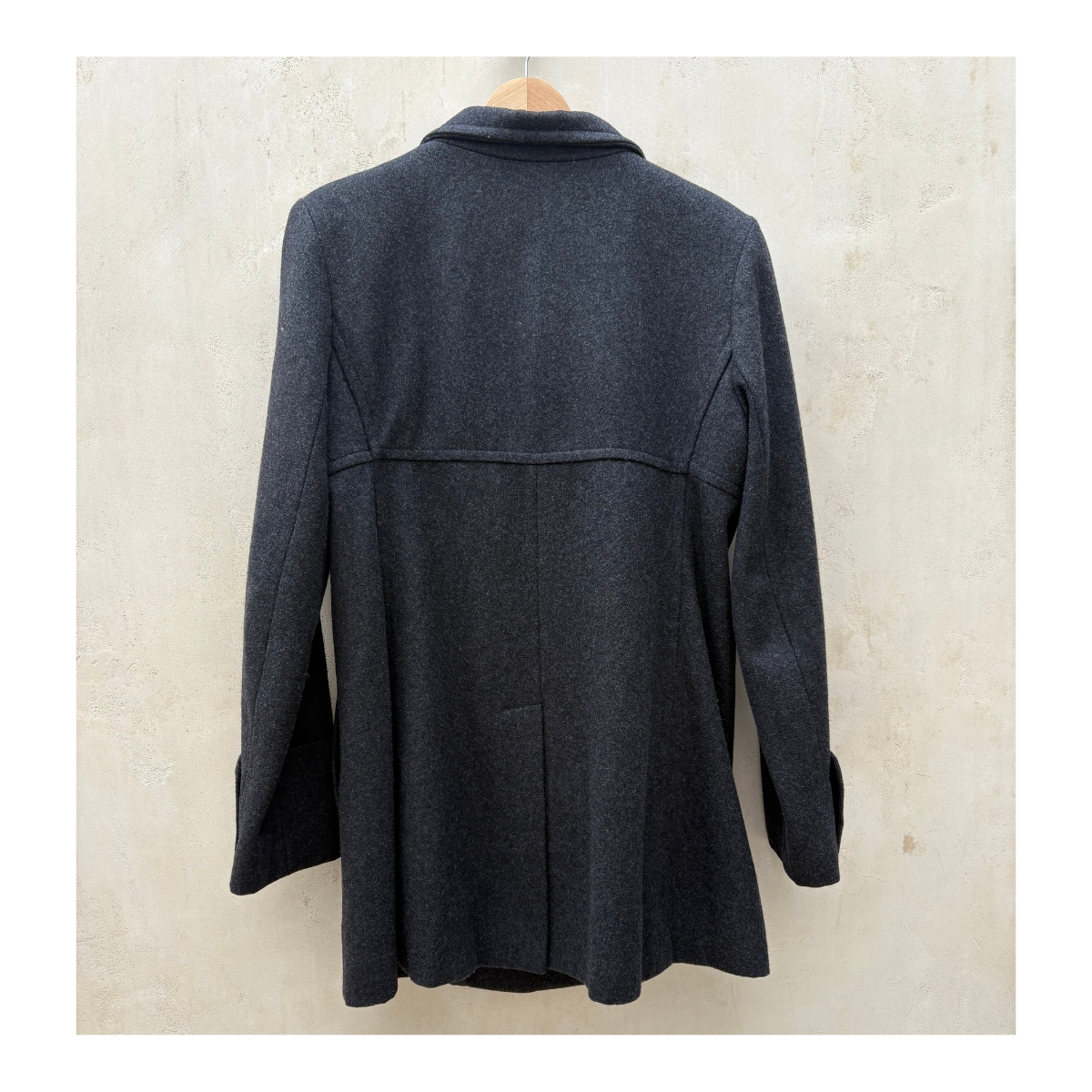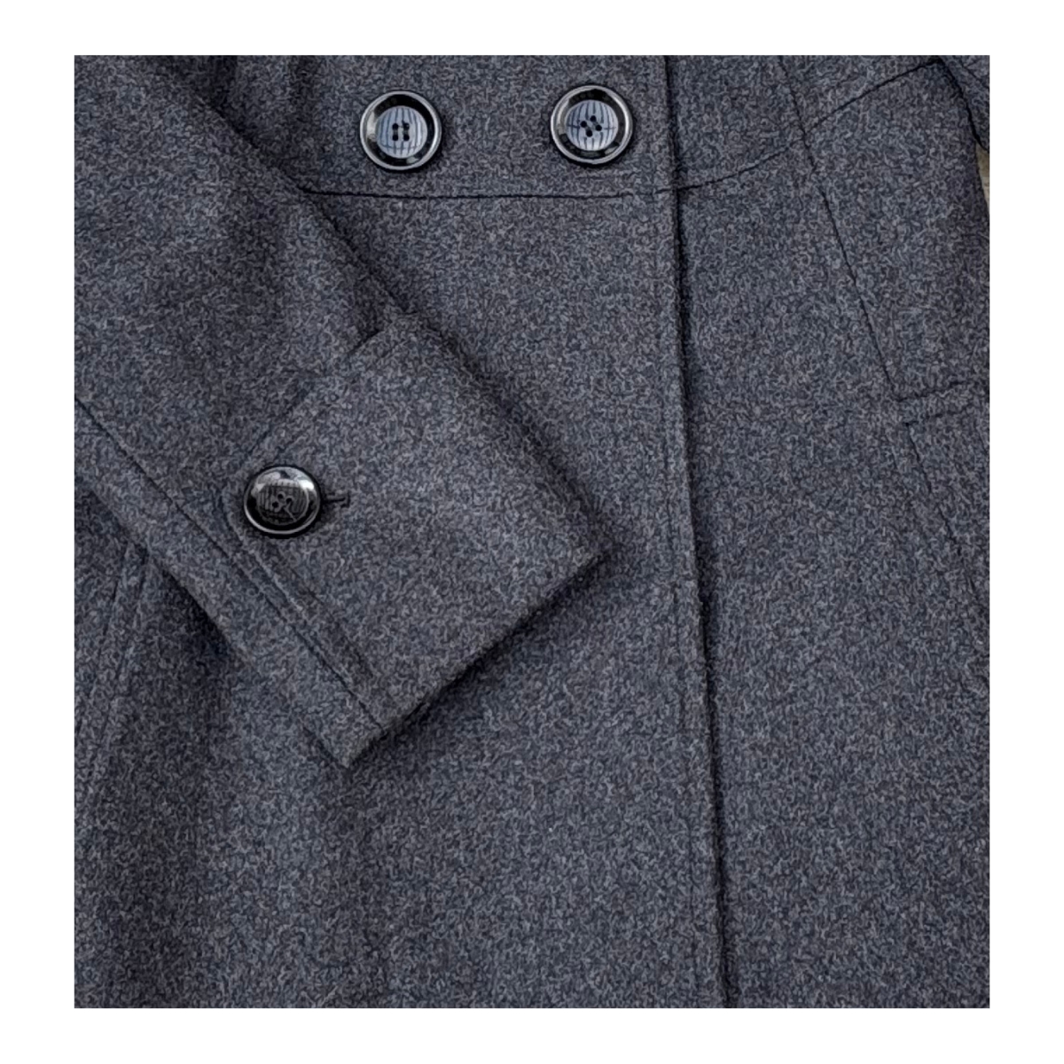 Abrigo en gris marengo La construcción revela un dominio de la sastrería clásica. El tejido de lana otorga cuerpo y caída natural, desplegándose en movimiento con cada paso. El cuello alto envolvente nace de una solapa estudiada, creando un juego arquitectónico que enmarca el rostro. Los botones negros de resina pulida brillan como pequeñas joyas sobre el gris marengo. Los bolsillos laterales, insertados con precisión milimétrica, se funden con las líneas del diseño. Los puños definidos enmarcan las muñecas con autoridad sastre. La espalda, atravesada por un corte maestro, libera el movimiento mientras mantiene la estructura.