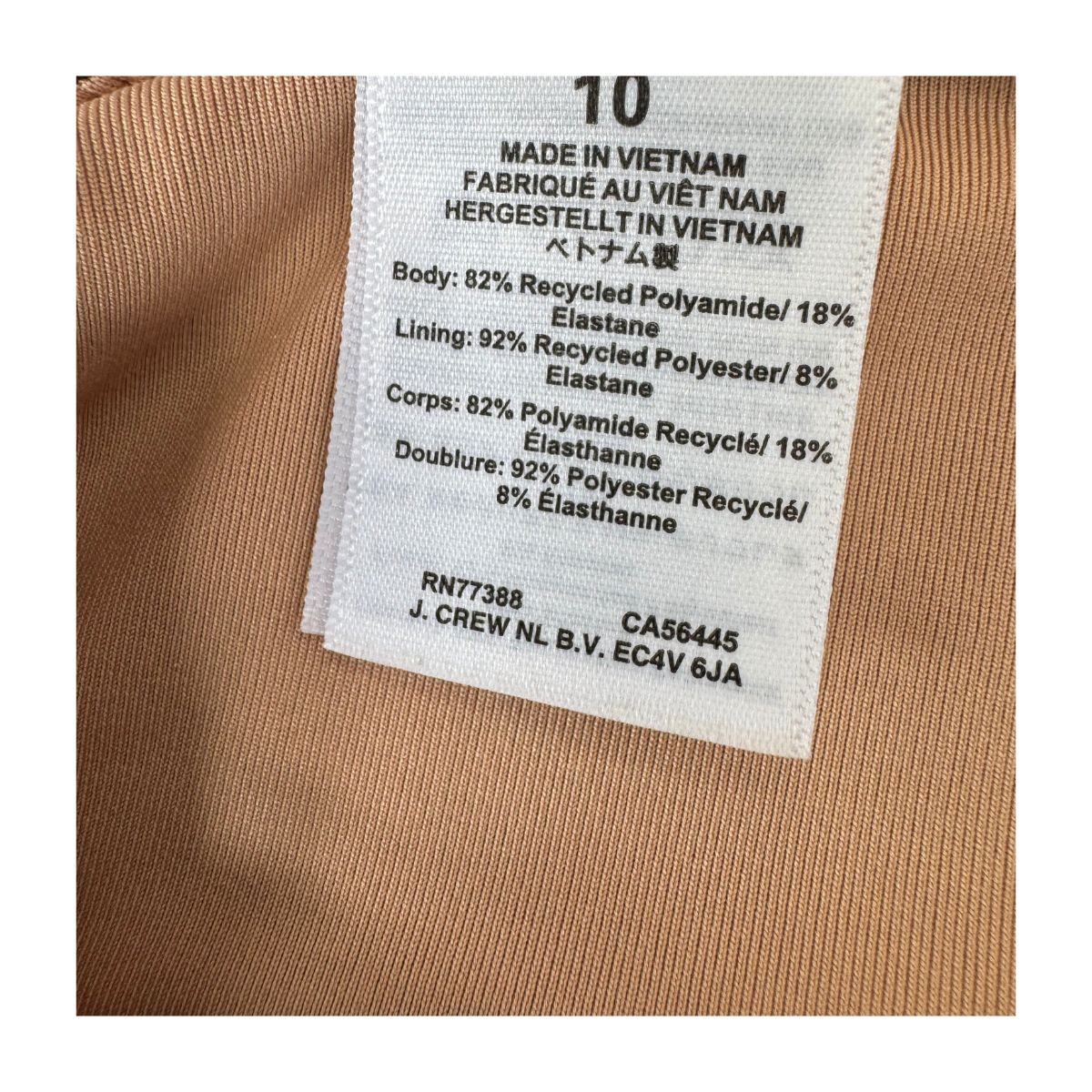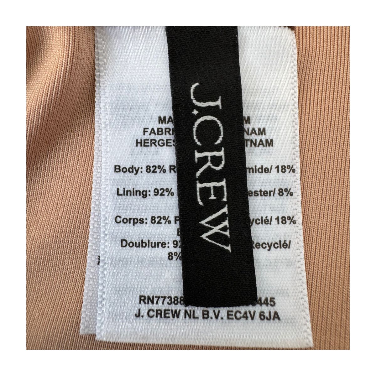 - Composición: 82 % poliamida reciclada / 18 % elastano (cuerpo); 92 % poliéster reciclado / 8 % elastano (forro)