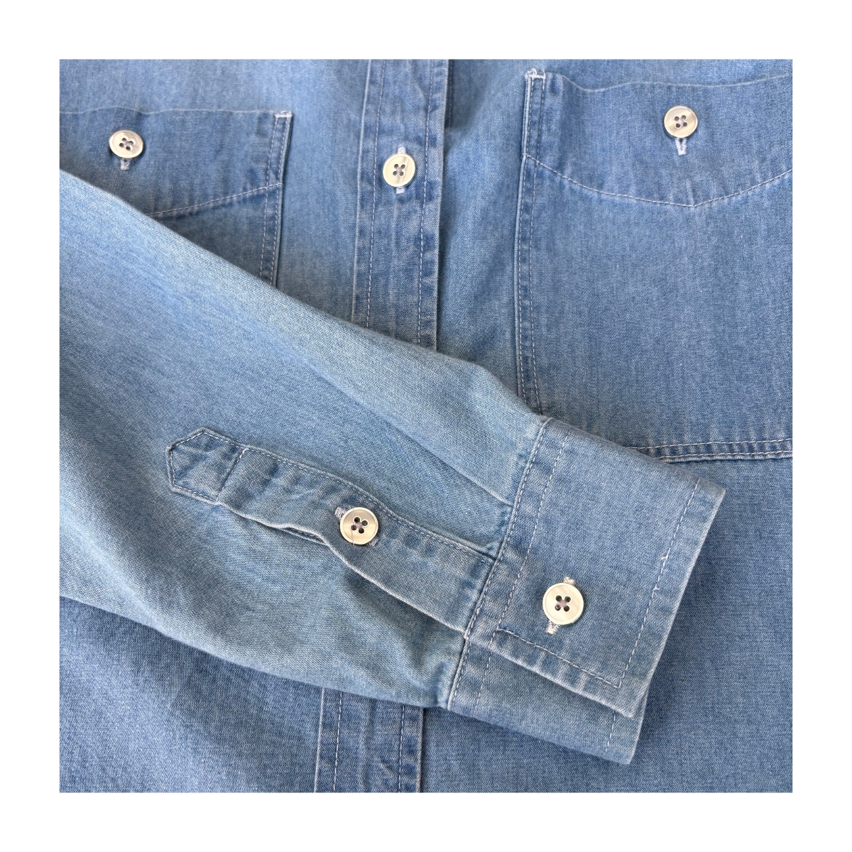 Camisa chambray Algodón premium Un tejido que respira California – liviano pero con carácter, suave pero con presencia. Cada elemento está considerado: los bolsillos crean líneas puras, los pespuntes trazan caminos perfectos, los botones danzan con la luz. El corte permite que el chambray revele su naturaleza más bella, mientras el canesú trasero con su pliegue central crea un paisaje de luz y sombra que se transforma con cada gesto.