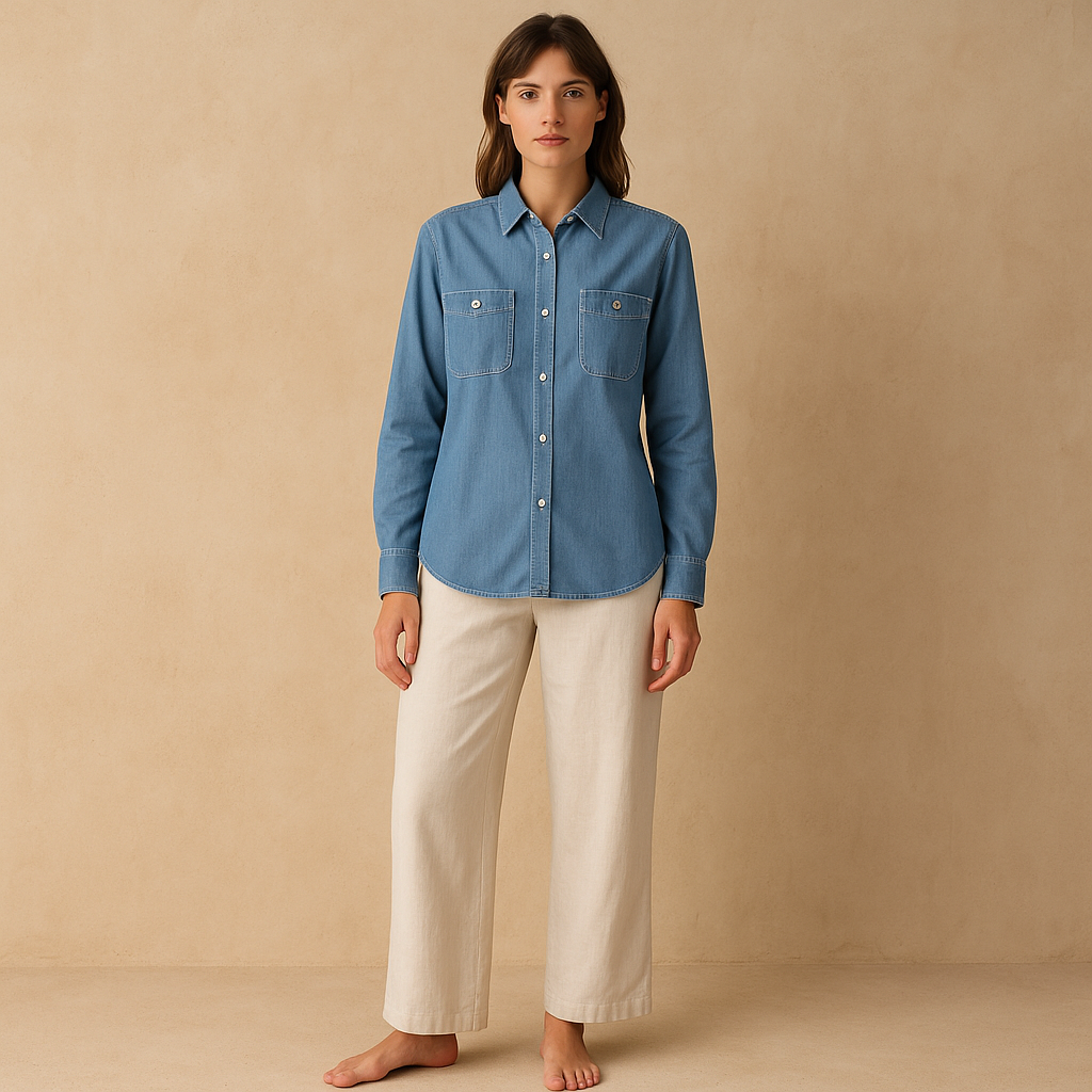 Cada lavado es un ritual – agua fría, del revés, con amor. Déjala secar al aire, como las mañanas de Los Ángeles. Si deseas, plancha cuando aún guarde un suspiro de humedad. El chambray te responderá volviéndose más tuyo cada día, guardando en su trama las historias compartidas.