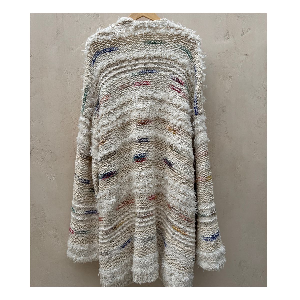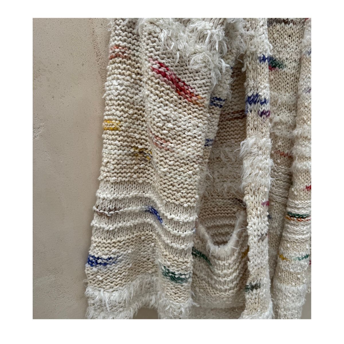 Este cárdigan Margo vainilla tostado tiene una mezcla de algodón con lana, que crea una textura rica y acogedora, perfecta para esos momentos de confort estudiado. Los bolsillos frontales, el corte largo y relajado, y los detalles de flecos estratégicamente ubicados transforman una pieza casual en una declaración de estilo. El punto grueso artesanal le confiere ese aire de pieza única que tanto buscamos.