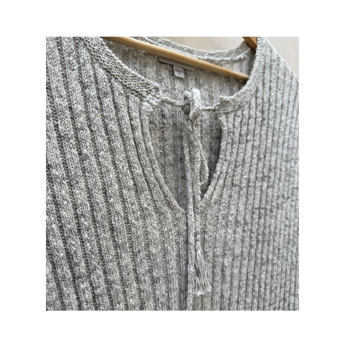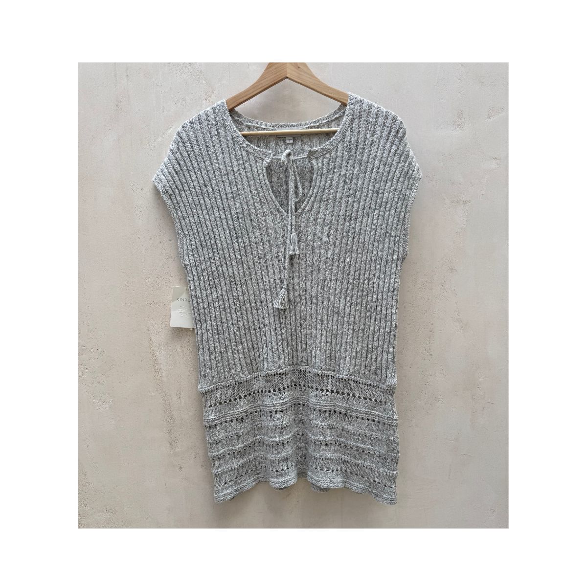 Chaleco Kinross punto artesanal. La refinada simplicidad costera se materializa en esta prenda  donde el cuerpo acanalado fluye hacia un elaborado bajo calado. Los cordones trenzados del escote evocan nudos marineros, mientras la silueta sin mangas mantiene esa elegancia relajada tan característica de los veranos en Hampton.