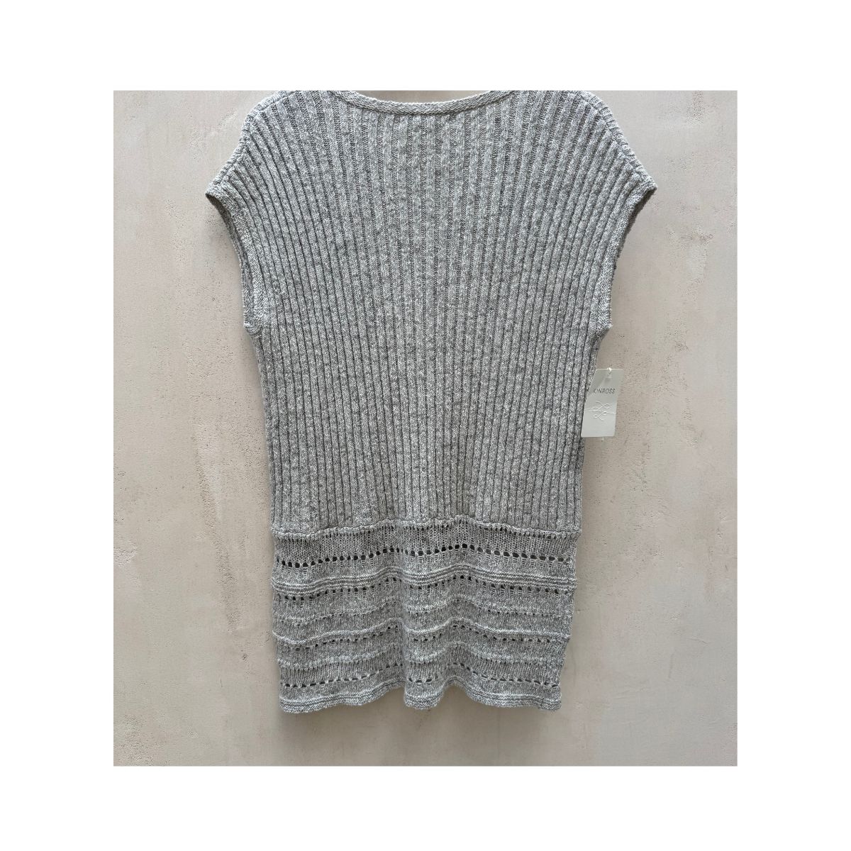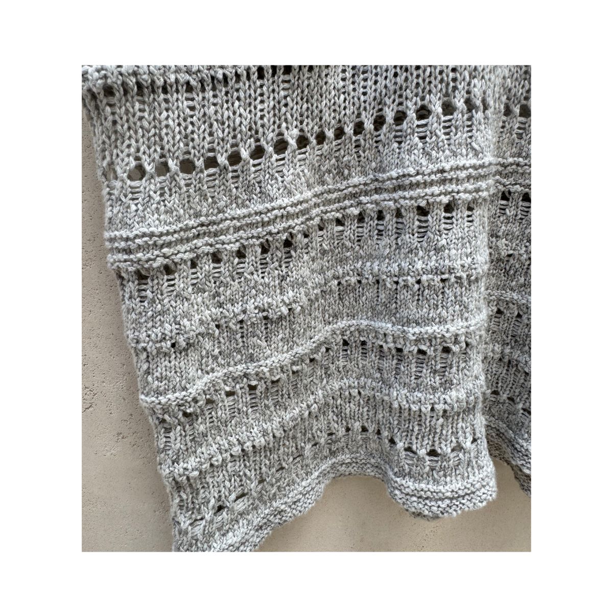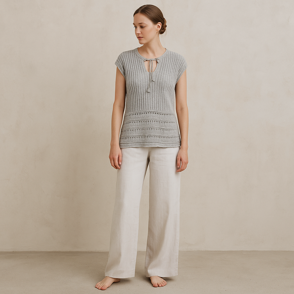 Chaleco Kinross en algodón puro con elegante punto acanalado vertical. El diseño sin mangas evoca la sofisticación costera con su escote de cordones trenzados y un bajo trabajado en calados geométricos que ondean como la marea. La textura acanalada del cuerpo se encuentra con el delicado trabajo arquitectónico del bajo, creando una pieza que respira elegancia náutica.