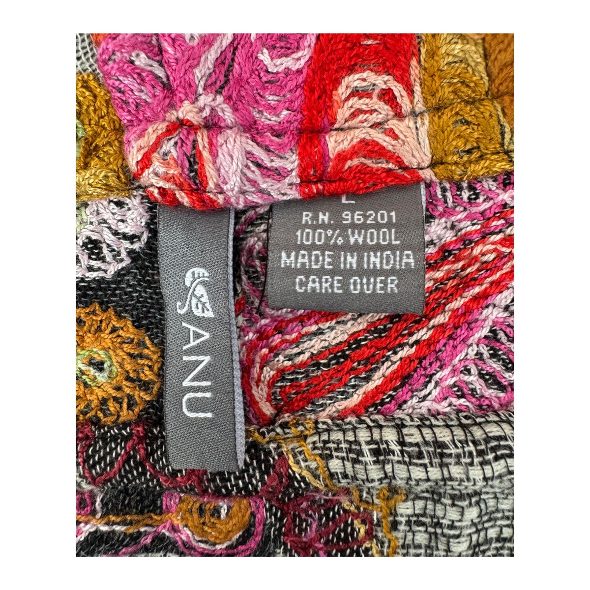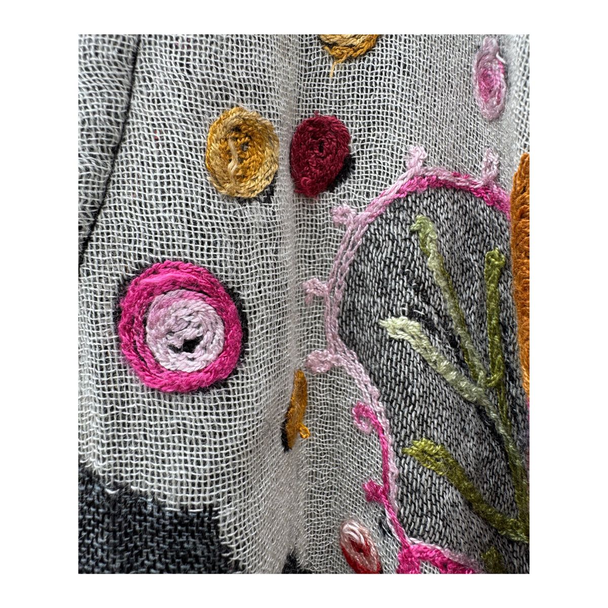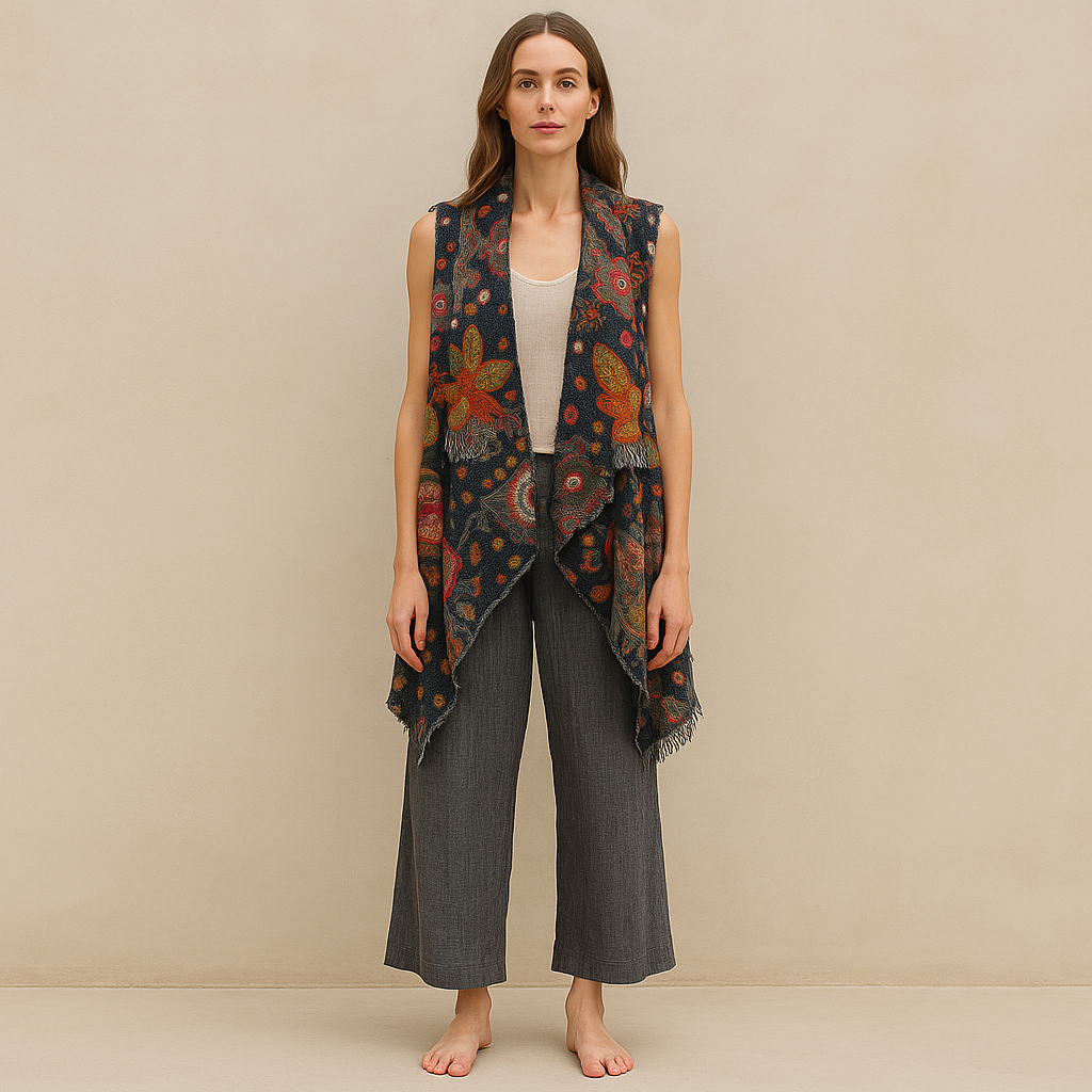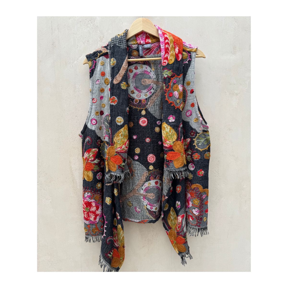 Chaleco artesanal bordado de lana. Pieza de artesanía textil que fusiona técnicas tradicionales con diseño contemporáneo. Los motivos bordados crean un paisaje abstracto de flores y círculos concéntricos, mientras que el contraste entre la base oscura y los detalles brillantes aporta profundidad visual.