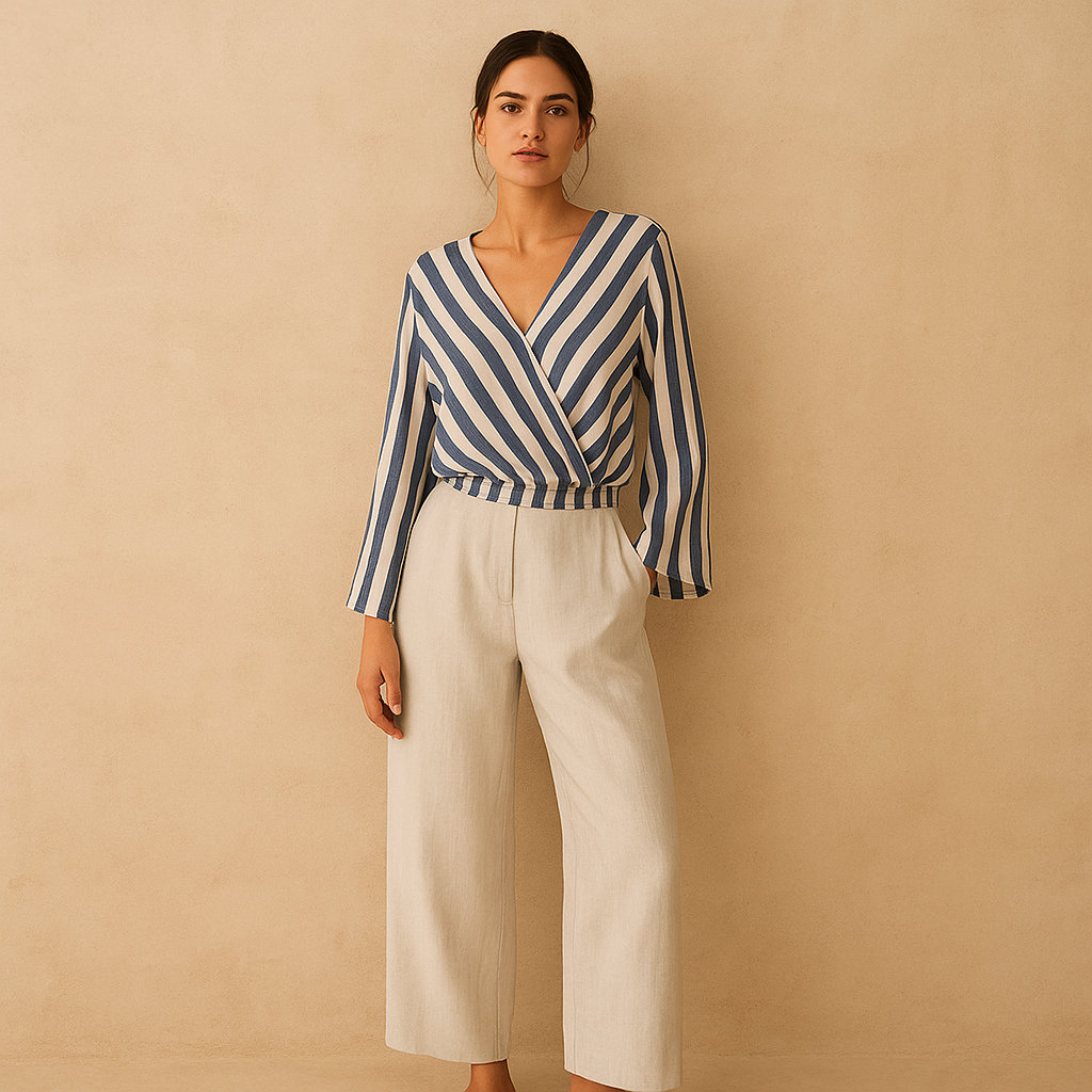 Top rayado Sadie Sage con diseño envolvente, mangas acampanadas y patrón diagonal