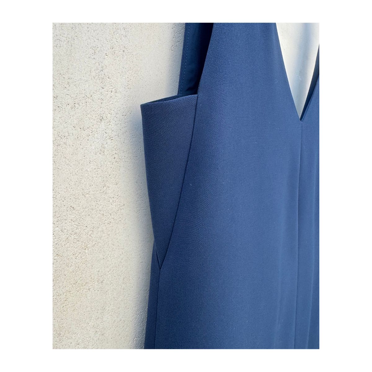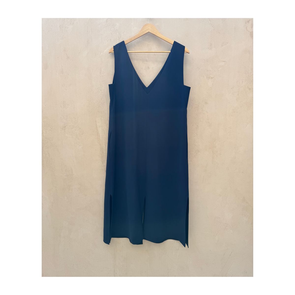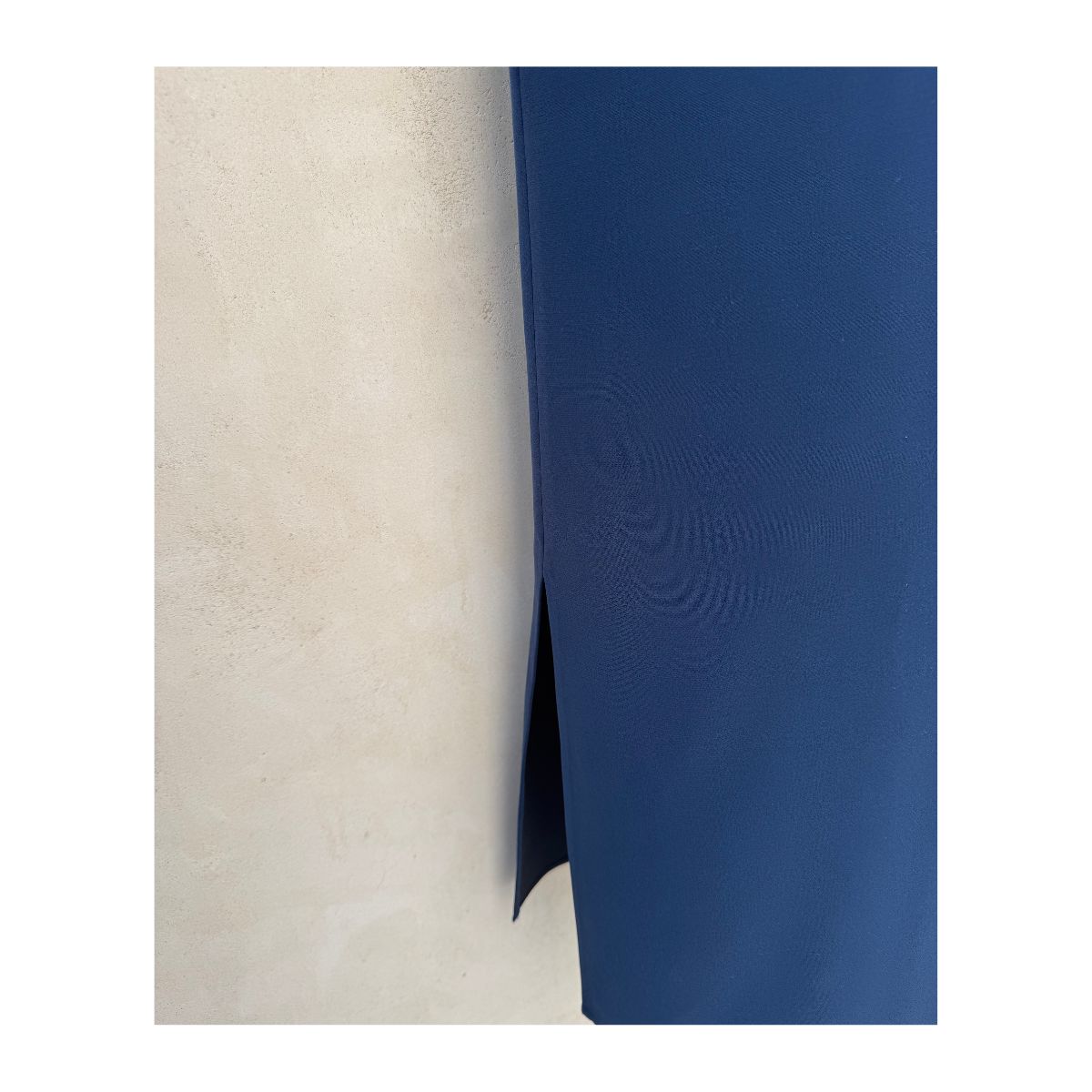 EL vestido midi azul marino, con su caída impecable y tacto sedoso, responde al movimiento como una segunda piel. El corte, aparentemente simple pero matemáticamente preciso, crea una silueta que honra la femineidad sin imponerla. Los detalles – desde la profundidad exacta del escote hasta la altura estratégica de las aberturas – hablan de esa atención meticulosa que distingue al verdadero lujo.