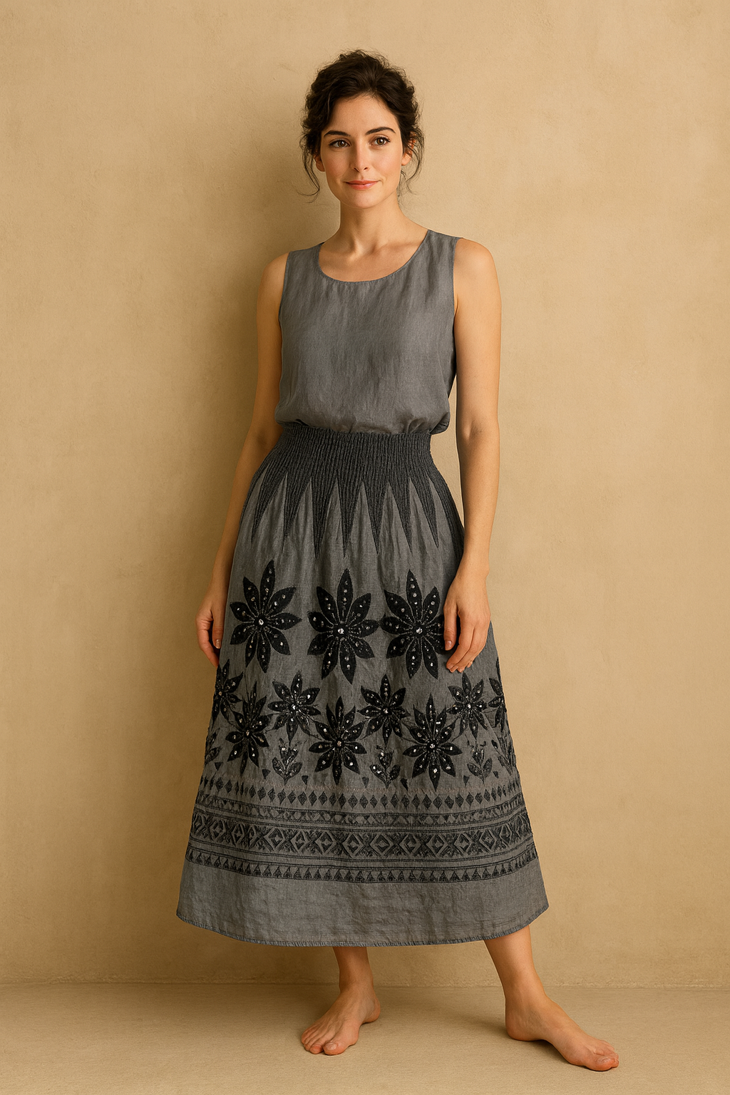 La magia del artesanal smocking domina la cintura de esta falda larga, donde el gris profundo se despliega en precisos pliegues que danzan hacia un gris suave como la niebla. Dos franjas de aplicaciones florales en negro, delicadamente iluminadas con lentejuelas, crean un ritmo visual que culmina en un borde de motivos tribales, fusionando técnicas ancestrales con un espíritu contemporáneo.