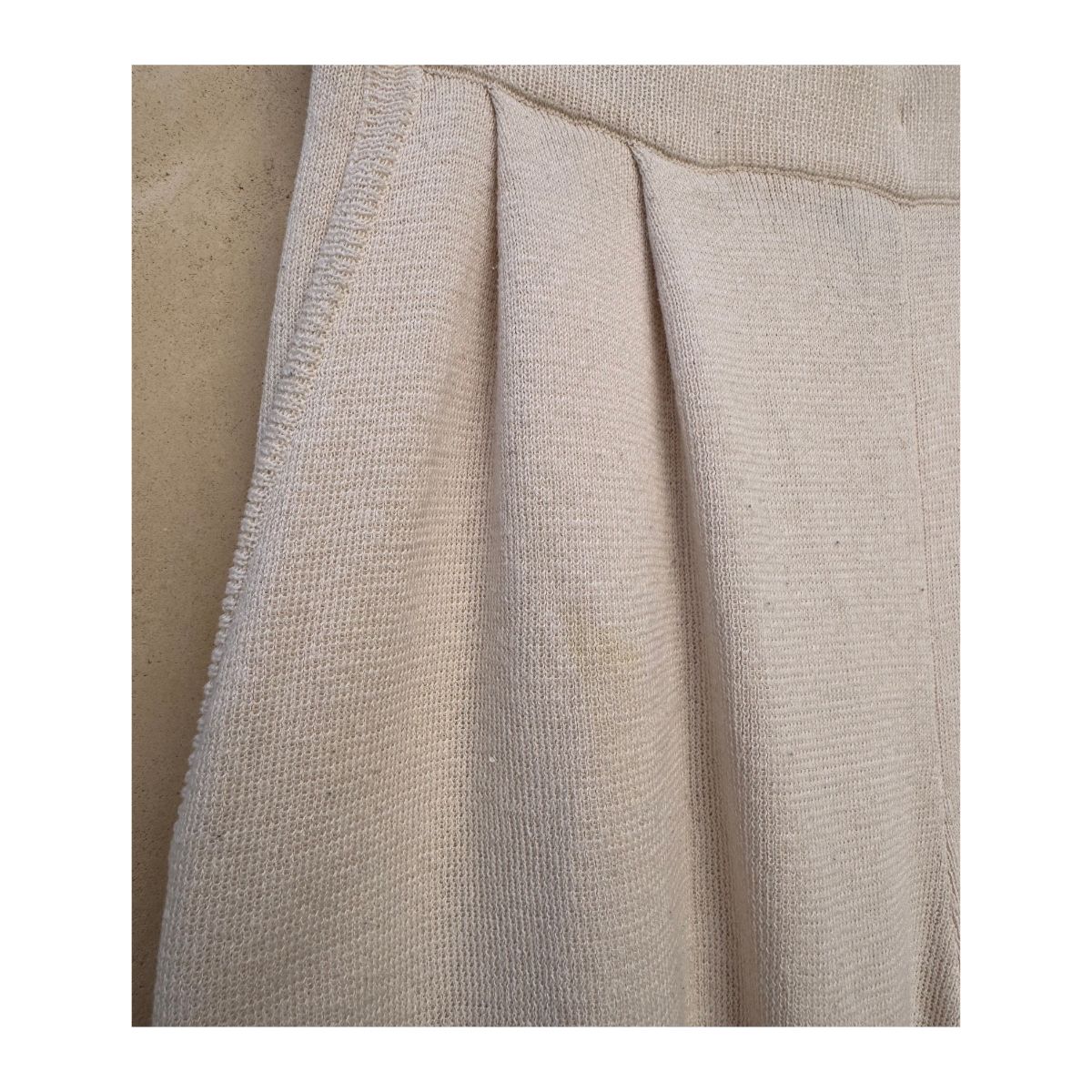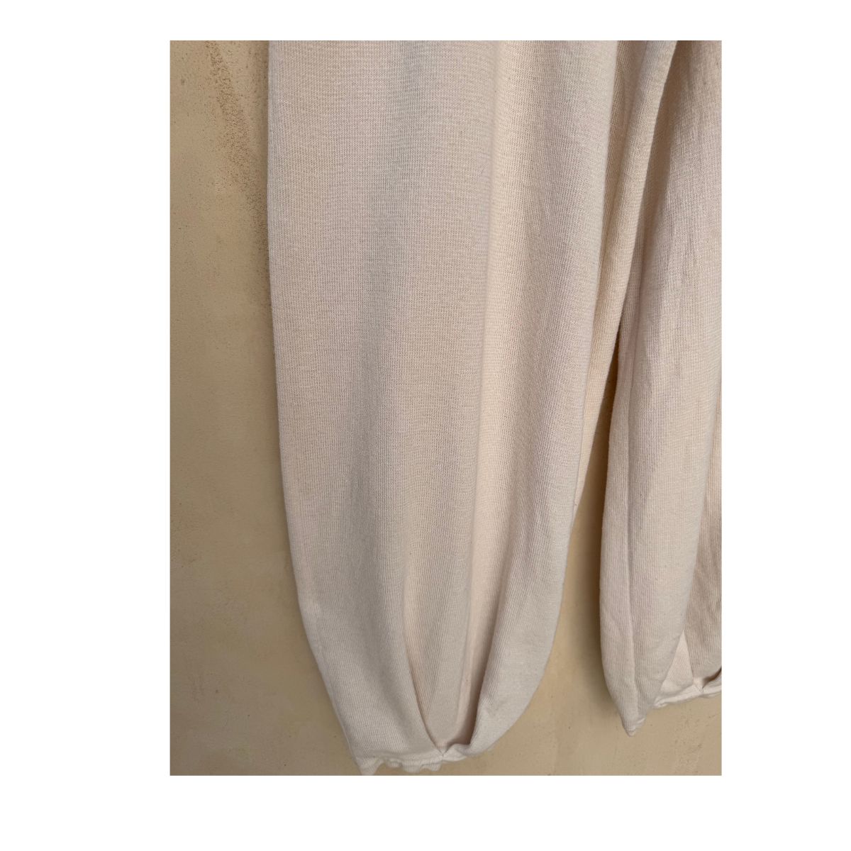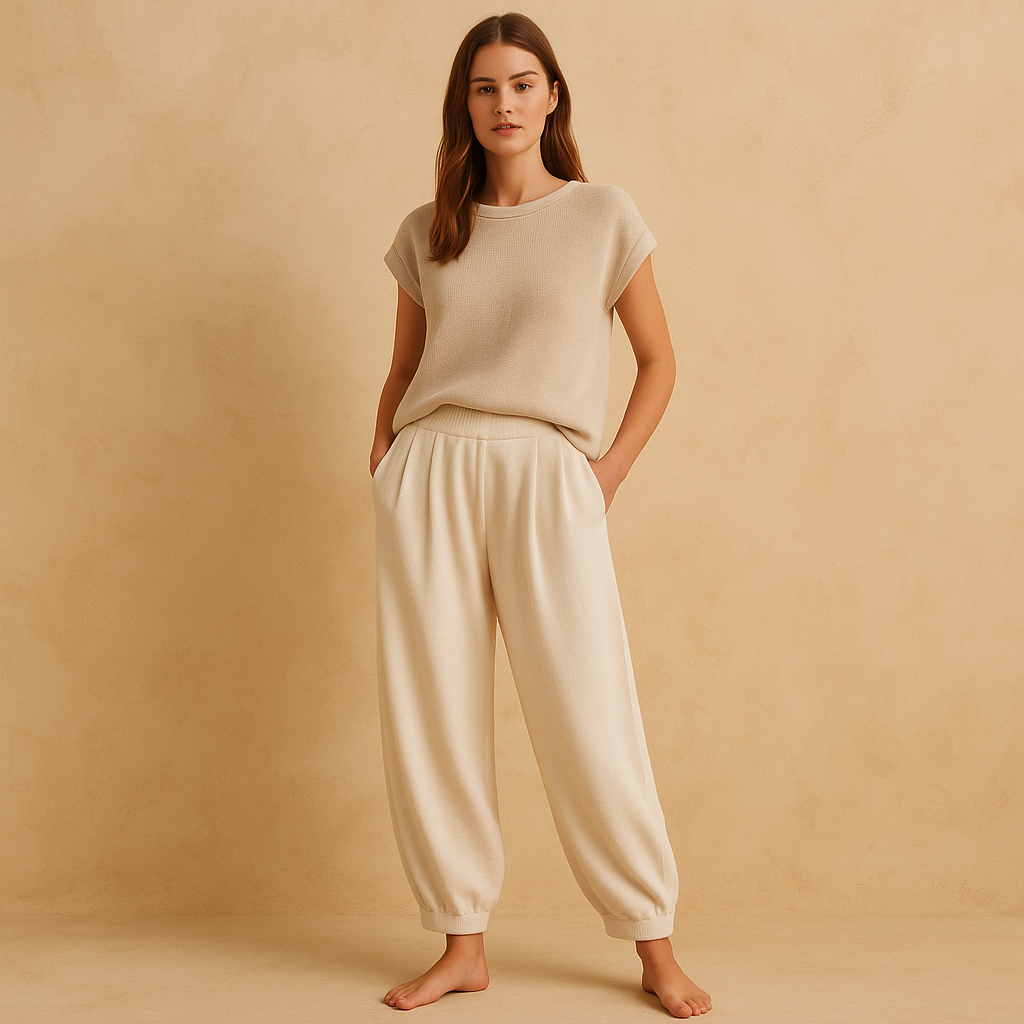 Cada detalle está pensado para crear una pieza excepcional: la cintura elástica alta diseñada para un ajuste perfecto, los pliegues estratégicamente colocados que esculpen la silueta, y el punto con mezcla de lino que cae con una elegancia natural. Un básico elevado que transforma el concepto del loungewear en una declaración de estilo.
