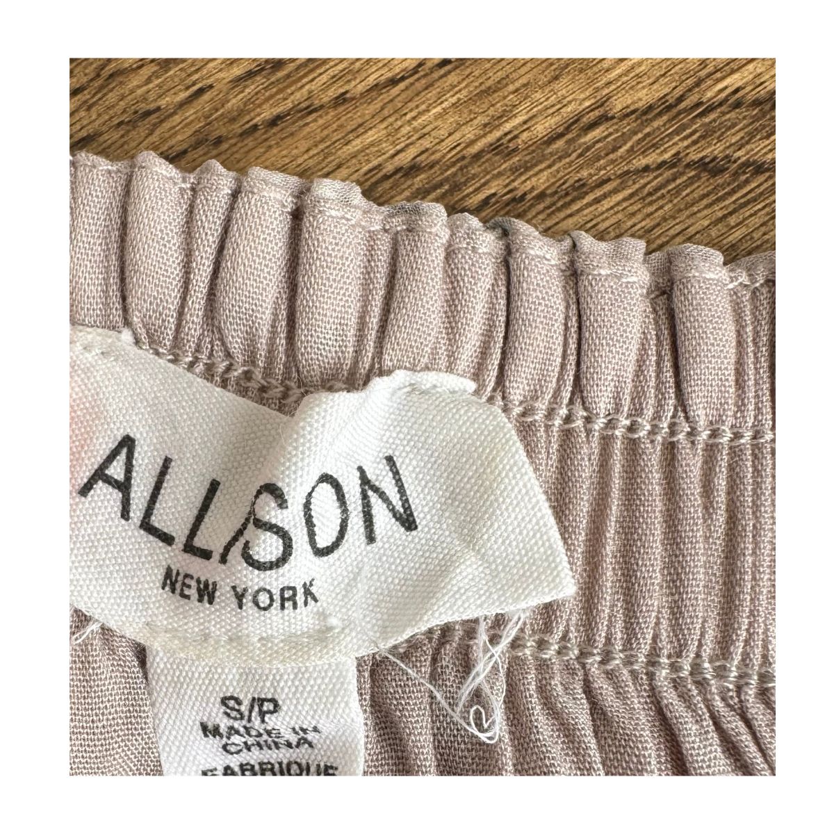 Mini falda Allison NY Construcción triple elaborada con maestría textil. La capa superior presenta un delicado estampado floral en tonos grises y negros sobre un fondo beige suave, con trazos que evocan la técnica del sumi-e japonés. La banda central exhibe un encaje blanco de patrón geométrico complejo con borde festoneado artesanal. La base, en tul rosa pálido, está adornada con tachuelas doradas estratégicamente colocadas que crean un patrón de constelaciones modernas.