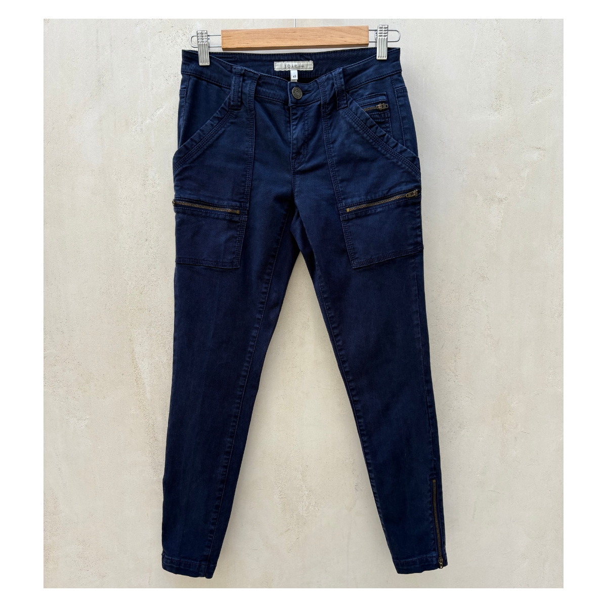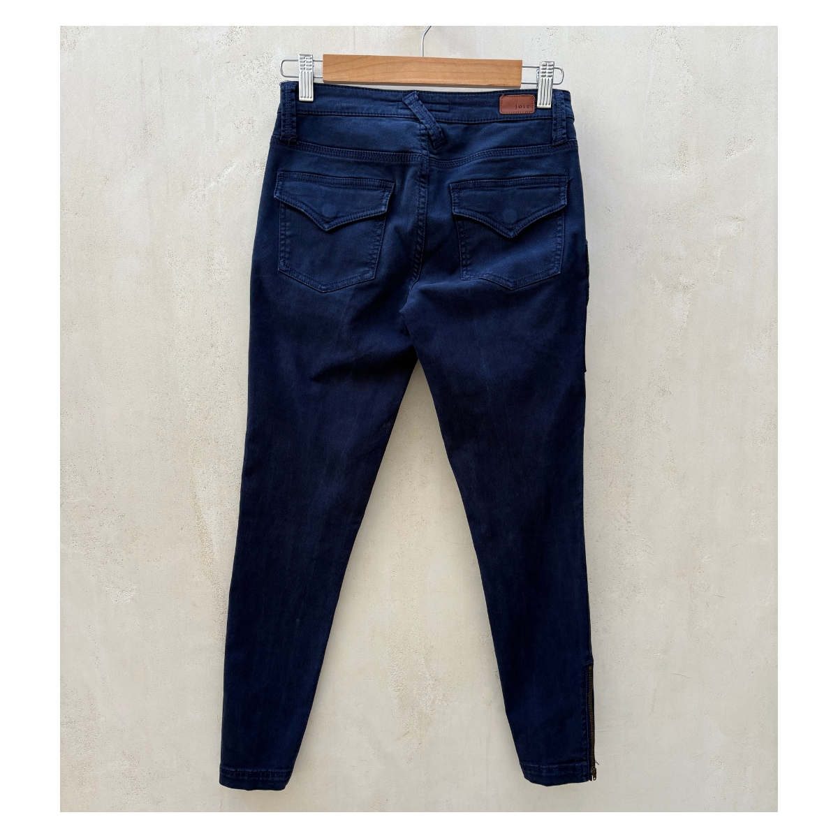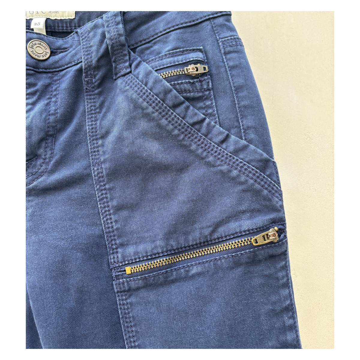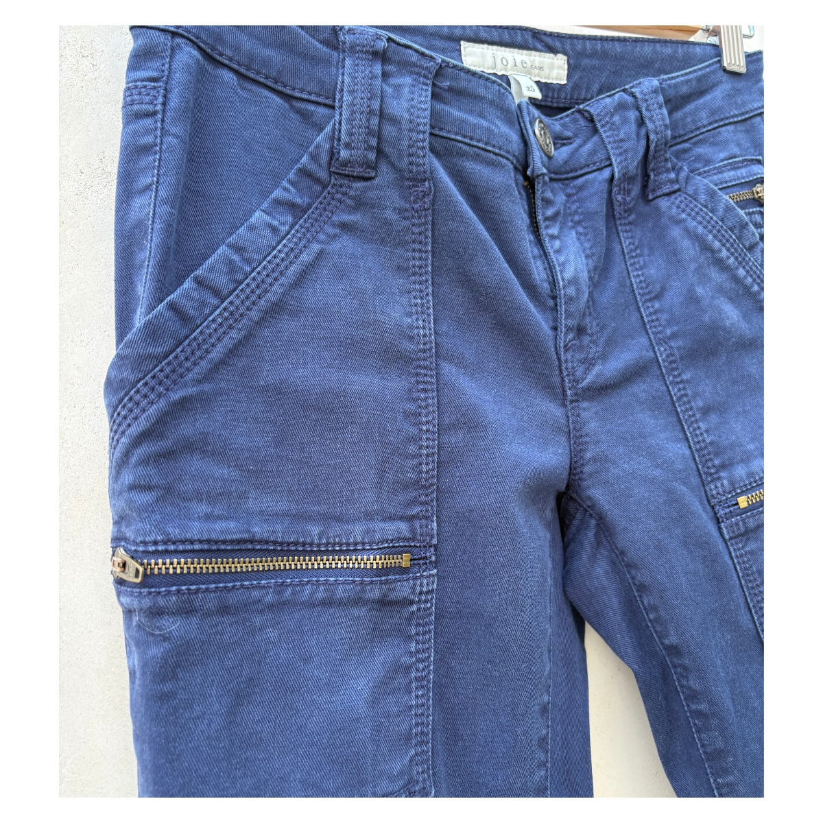 Pantalón skinny azul Joie. La construcción skinny abraza cada curva creando una silueta que parece hecha a medida. Los bolsillos cargo, reposicionados estratégicamente, integran sus cierres metálicos en diagonal creando líneas que estilizan. El lavado índigo profundo revela sutiles matices bajo diferentes luces, mientras el tejido con lyocell envuelve el cuerpo con suavidad sedosa.