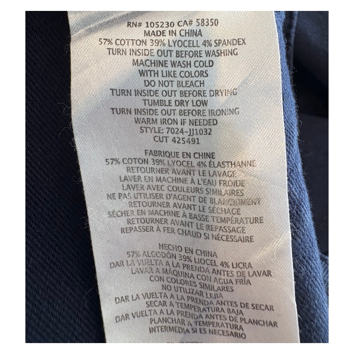 - Composición: 57 % algodón, 39 % lyocell, 4 % spandex