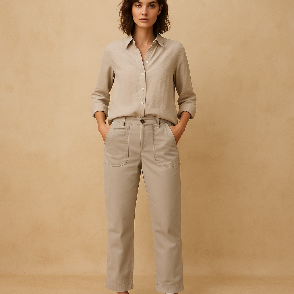 Capas: Camisa de popelín blanco con cuello mandarín, las mangas recogidas con precisión hasta el codo. Sobre ella, un chaleco de punto fino en azul marino, con botones de nácar antiguos.