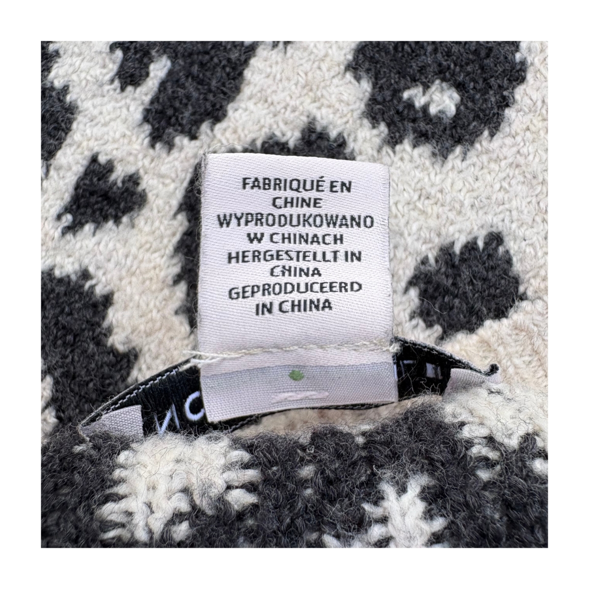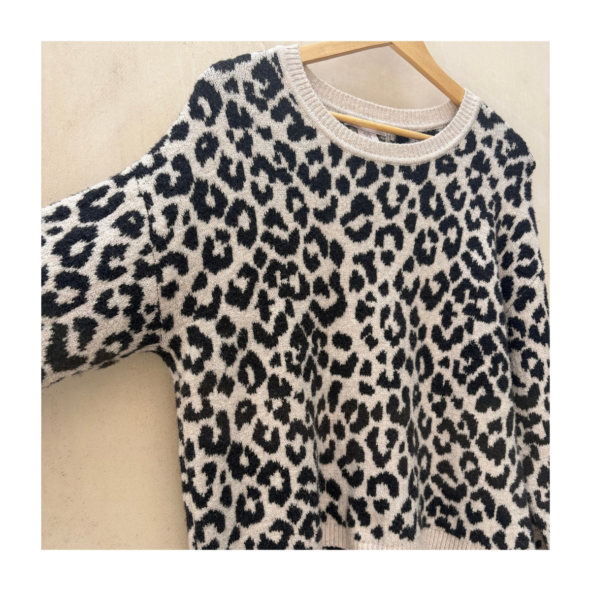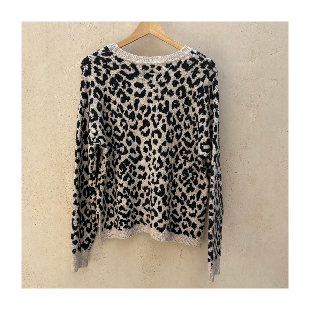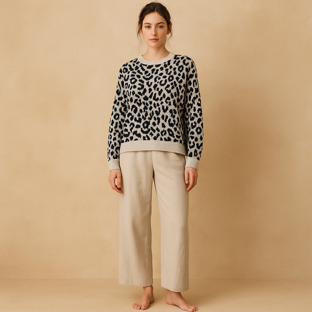Pullover leopardo beige negro La construcción del tejido revela una técnica de punto estudiada donde cada motivo leopardo está perfectamente definido y distribuido. El patrón animal se desarrolla de manera orgánica, creando un ritmo visual dinámico. Los puños y el bajo presentan un punto elástico doble que mantiene la forma y estructura. El cuello redondo trabajado con punto tubular asegura un acabado limpio que no pierde su forma. La densidad variable del tejido crea zonas de mayor y menor estructura que permiten que la prenda se adapte naturalmente.