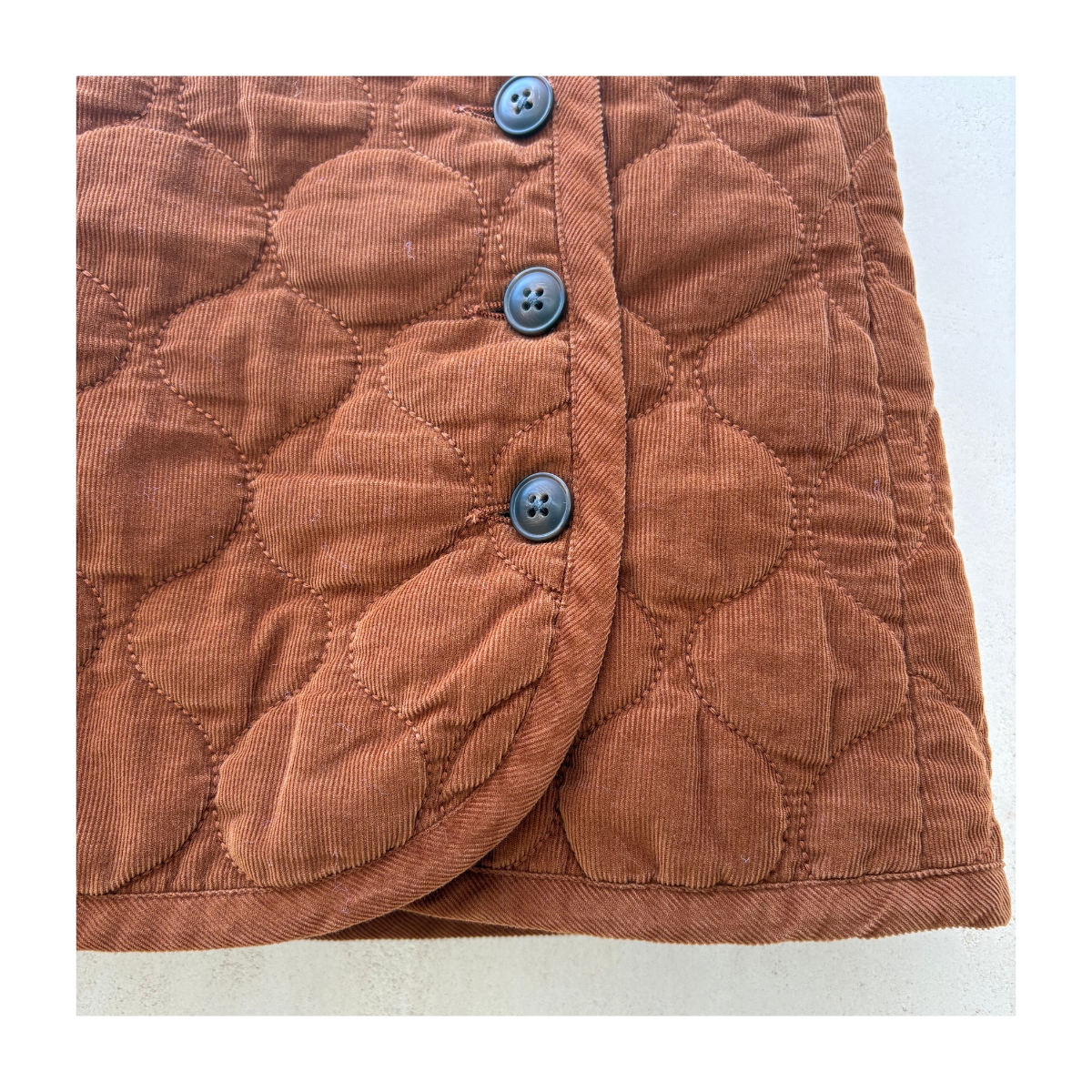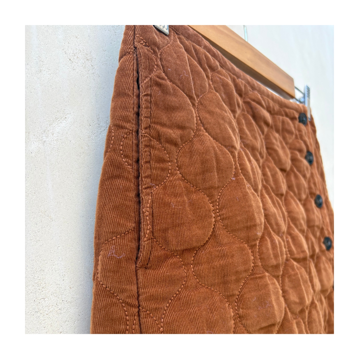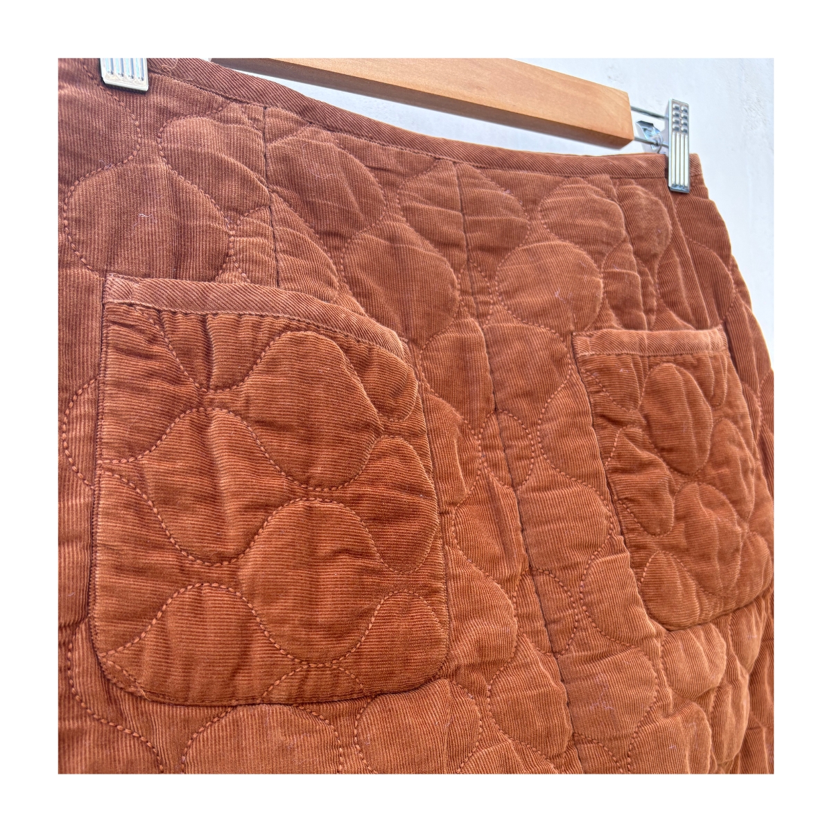 Quilted Corduroy Skirt en terracota, donde artesanía y confort se encuentran. El patrón circular quilted y los botones frontales crean una silueta envolvente que estiliza. Los bolsillos ocultos añaden funcionalidad a este diseño que combina calidez y sofisticación.