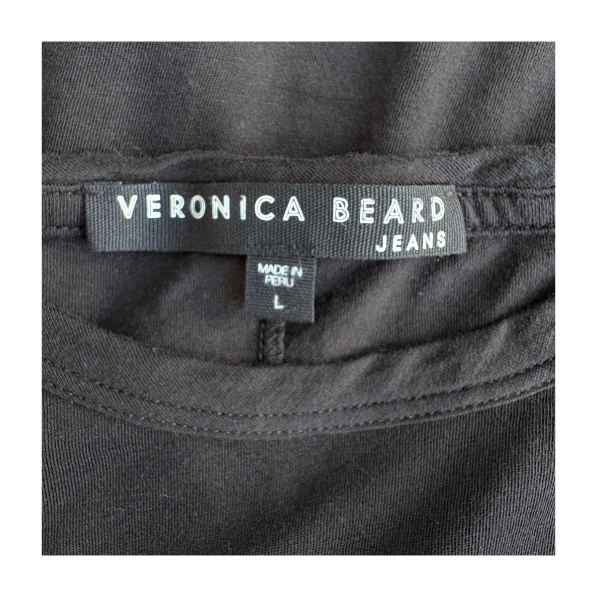 El negro profundo de la camiseta dialoga con una falda midi plisada en seda color champagne y botines de tacón medio en ante negro. Un abrigo de corte minimalista en lana bouclé añade textura y estructura. Los accesorios – un clutch geométrico en metal cepillado, pendientes arquitectónicos en oro mate y varias pulseras finas apiladas – aportan dimensión sin ostentación. Un pañuelo de seda con estampado abstracto en tonos tierra, anudado al asa del bolso, añade un toque artístico sutil. El conjunto transmite esa sofisticación natural que caracteriza al arte contemporáneo.