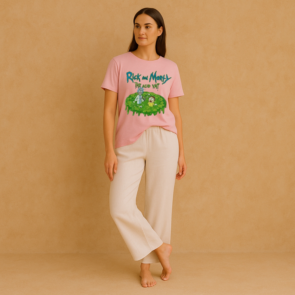 Tee Rick and Morty. Pieza coleccionista que captura la esencia subversiva de Rick and Morty en un lienzo de algodón premium. La ilustración, impresa con técnicas de alta definición, mantiene la viveza del ácido verde fluorescente que gotea, creando profundidad visual sobre el rosa pastel. El corte unisex contemporáneo presenta hombros caídos y un fit relajado que actualiza el clásico streetwear. El cuello redondo con acabado twin-needle y las costuras reforzadas revelan la atención al detalle. La etiqueta interior Hybrid [adult swim] certifica su autenticidad como pieza oficial.
