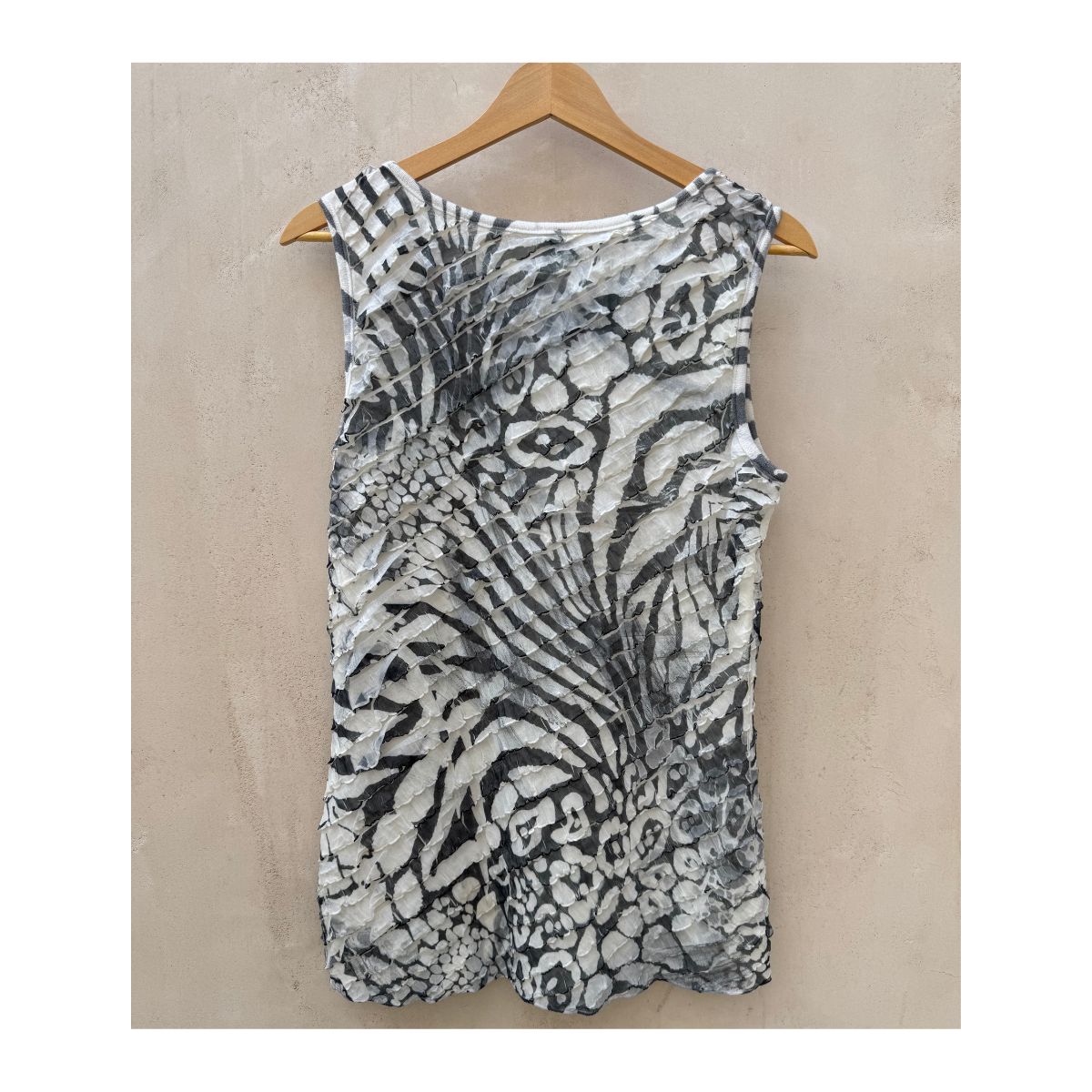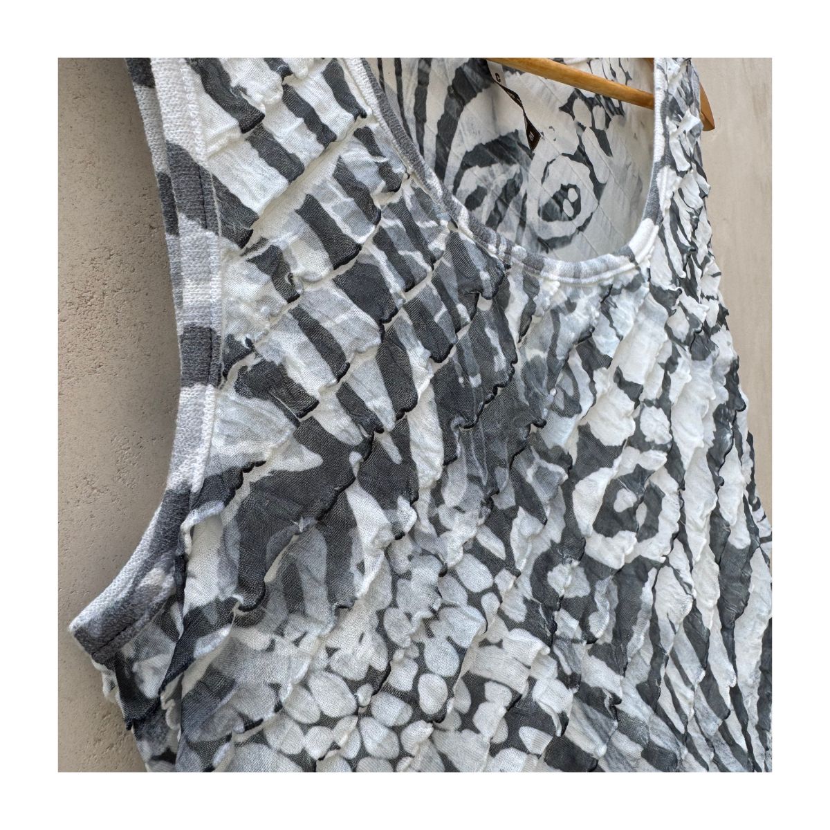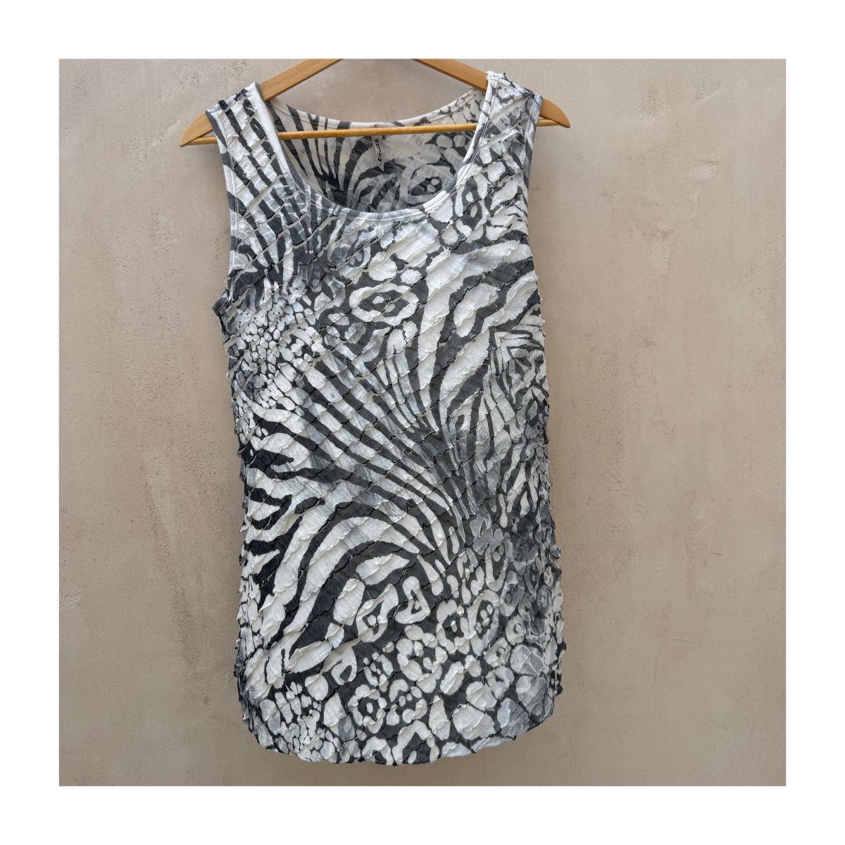 Esta blusa sin mangas de la marca Cubism combina textura y estampado en una pieza con carácter propio. El diseño tipo “crinkle” genera un efecto visual escultórico que acentúa su patrón gráfico tipo animal print abstracto en blanco, negro y gris. El fit relajado y la composición con spandex aportan movimiento y comodidad, mientras que su confección en EUA refuerza su valor de origen. Ideal para quienes buscan prendas con expresión artística y silueta fluida.
