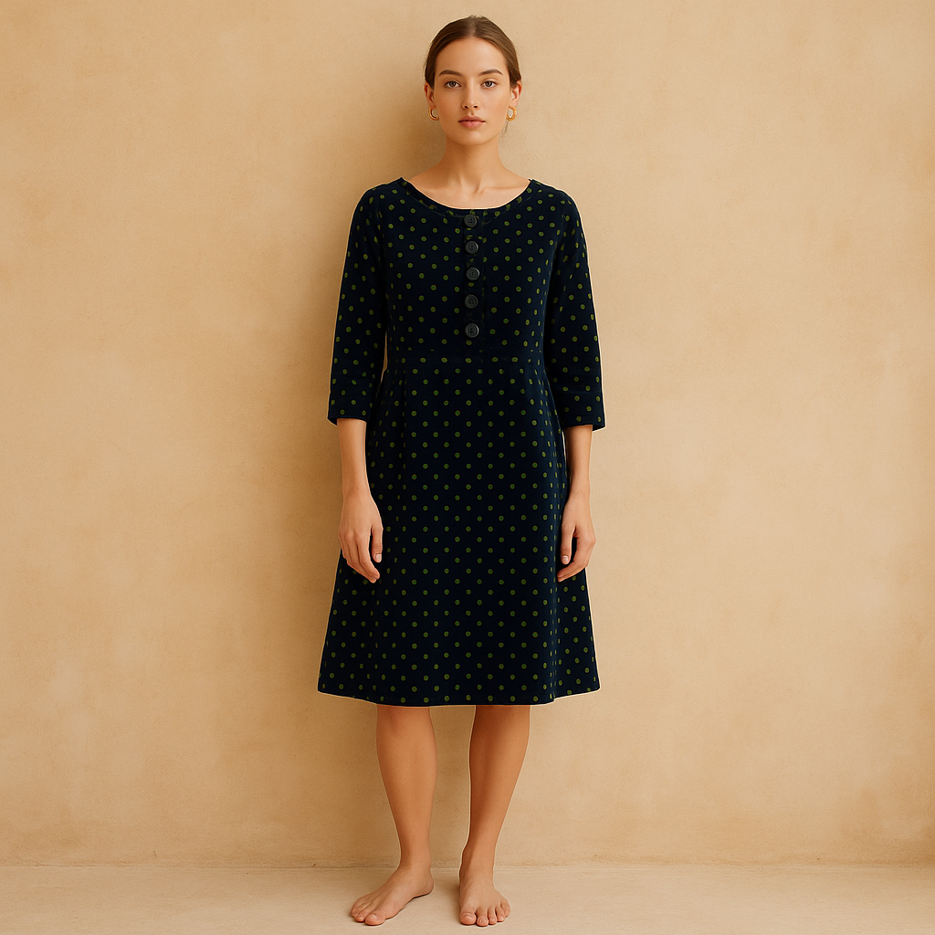 Un vestido que captura la esencia del estilo británico, donde la pana azul navy sirve de lienzo perfecto para lunares mostaza. Una pieza que transita con naturalidad desde un brunch en una terraza exclusiva hasta una cena en un club privado.