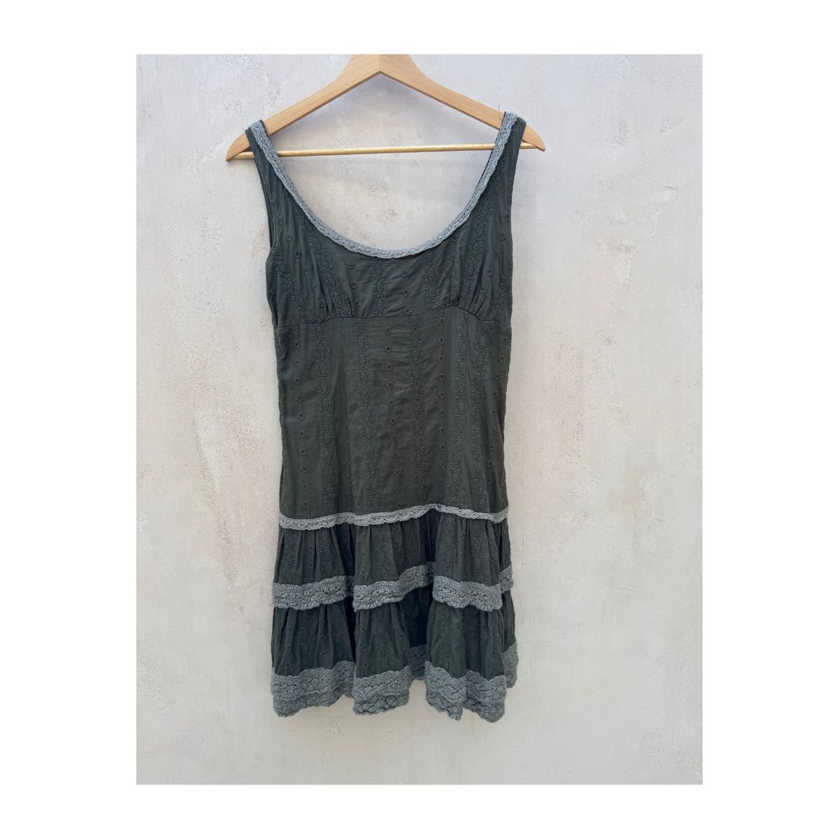 - Color: Olive intenso con encajes en gris perla
