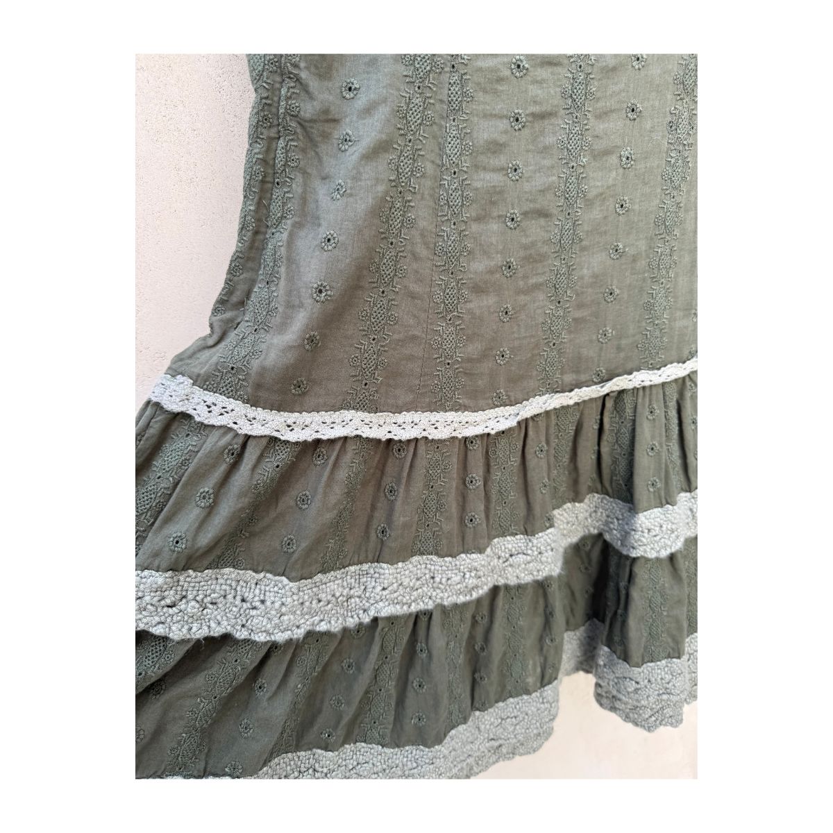 La construcción revela atención al detalle: el corte imperio abraza sutilmente, los volantes estratificados aportan movimiento y vida. El escote redondeado, bordeado con el mismo encaje delicado, enmarca con suavidad. Un vestido que honra las técnicas artesanales tradicionales con una sensibilidad moderna.