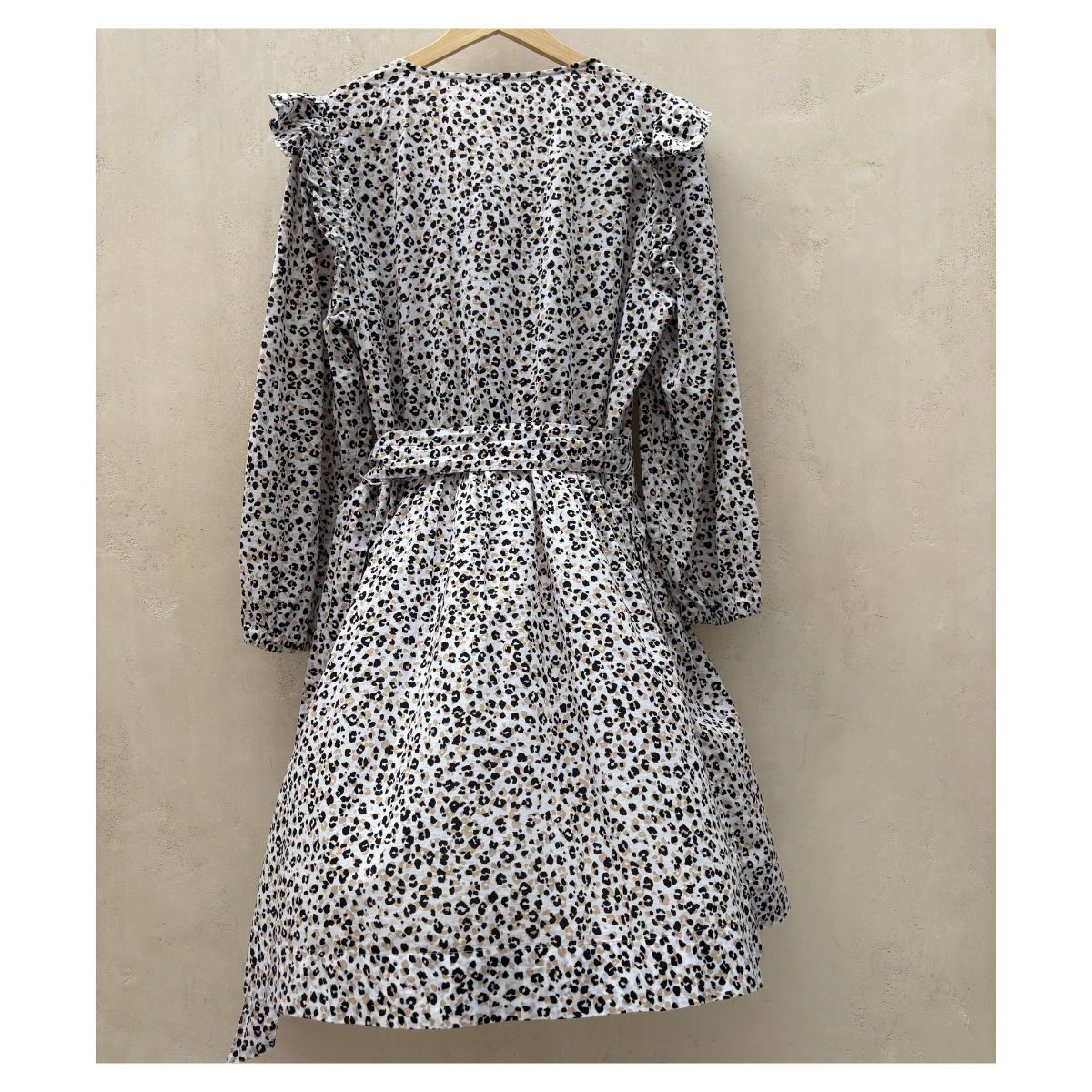Vestido con un delicado estampado de leopardo en tonos suaves que cae justo a la rodilla. El diseño incorpora hombros con volantes románticos y mangas largas abullonadas que aportan dramatismo. El escote en V profundo, la cintura definida con lazo y los prácticos bolsillos laterales crean una silueta favorecedora y funcional. Confeccionado en algodón 100% con forro interior del mismo material, garantizando comodidad y una caída impecable.