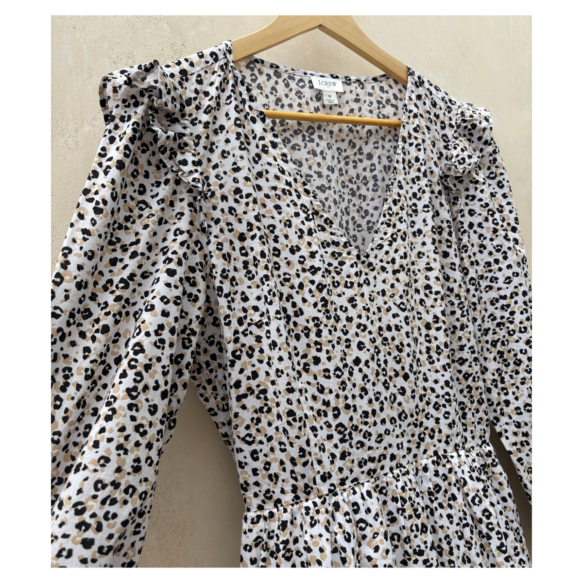 Vestido J.crew animal print. Los detalles marcan la diferencia en esta pieza de la colección Re-Imagined: el estampado animal en tonos neutros moderniza el clásico leopardo, mientras los volantes en hombros y el corte midi equilibran lo salvaje con lo sofisticado. La combinación de elementos románticos con un print atemporal hace de este vestido una pieza versátil para múltiples ocasiones.