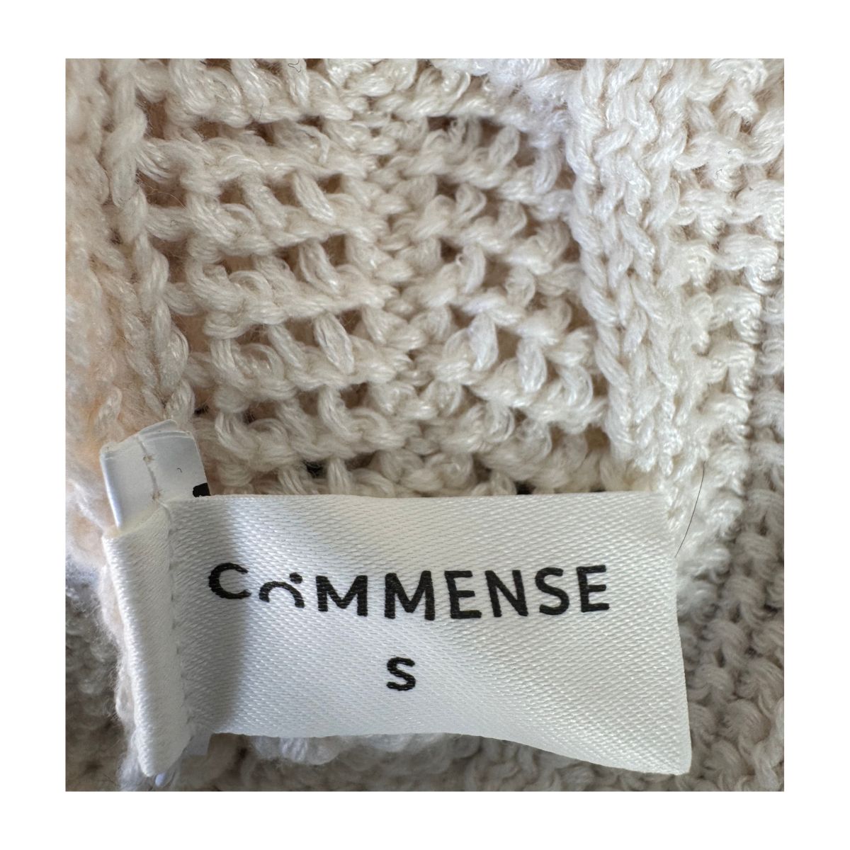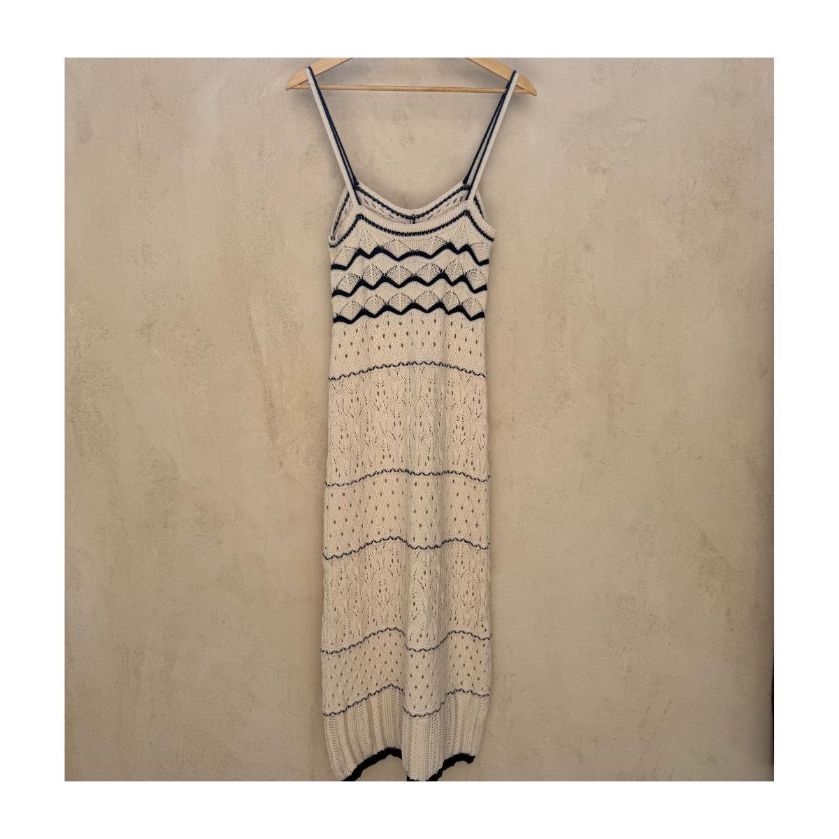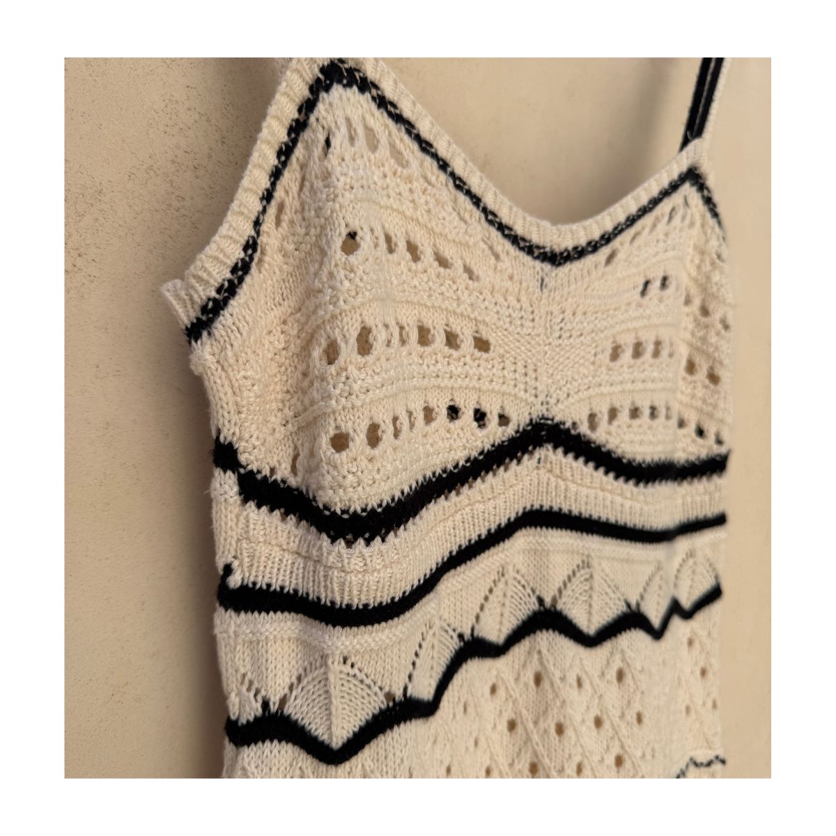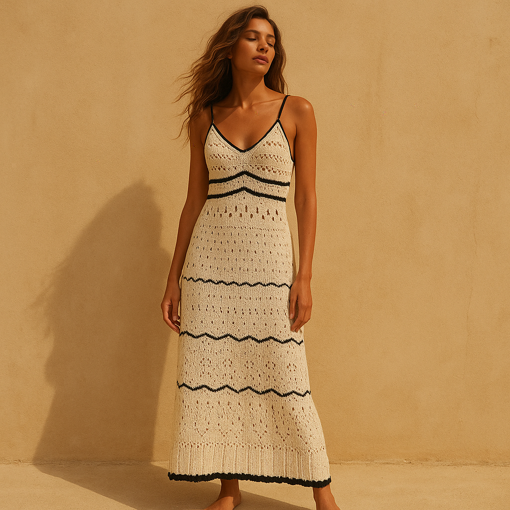 La sofisticación del punto artesanal se materializa en este vestido Commense que evoca las tardes de verano en la Riviera. Cada sección del vestido cuenta una historia diferente a través de sus patrones calados, creando un juego de luces y sombras sobre la piel. El contraste entre el marfil dominante y los ribetes negros añade un toque de distinción moderna al diseño artesanal.