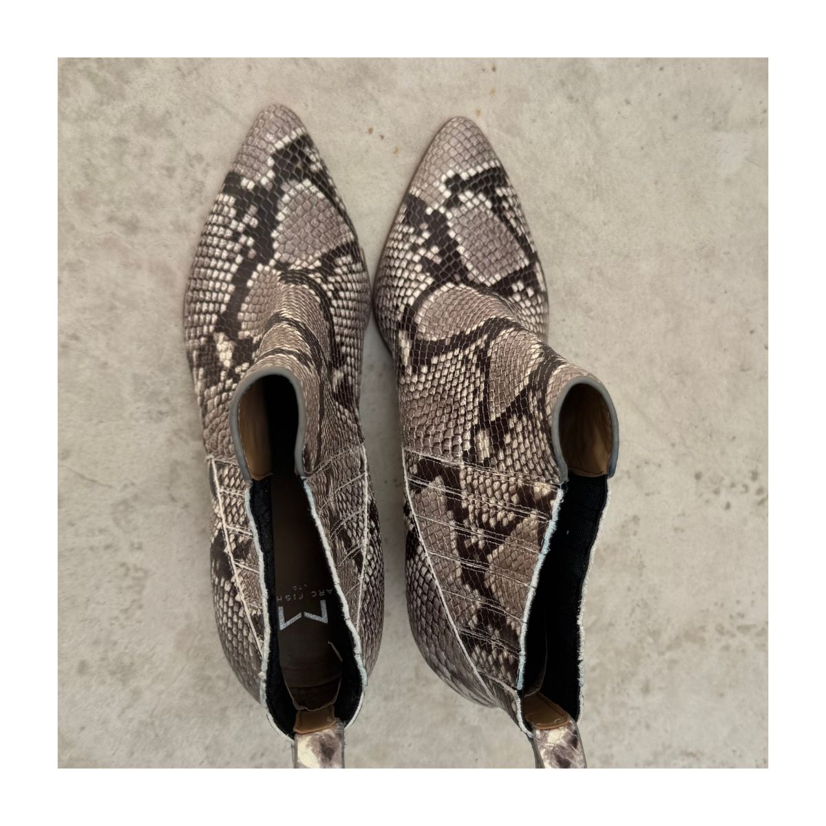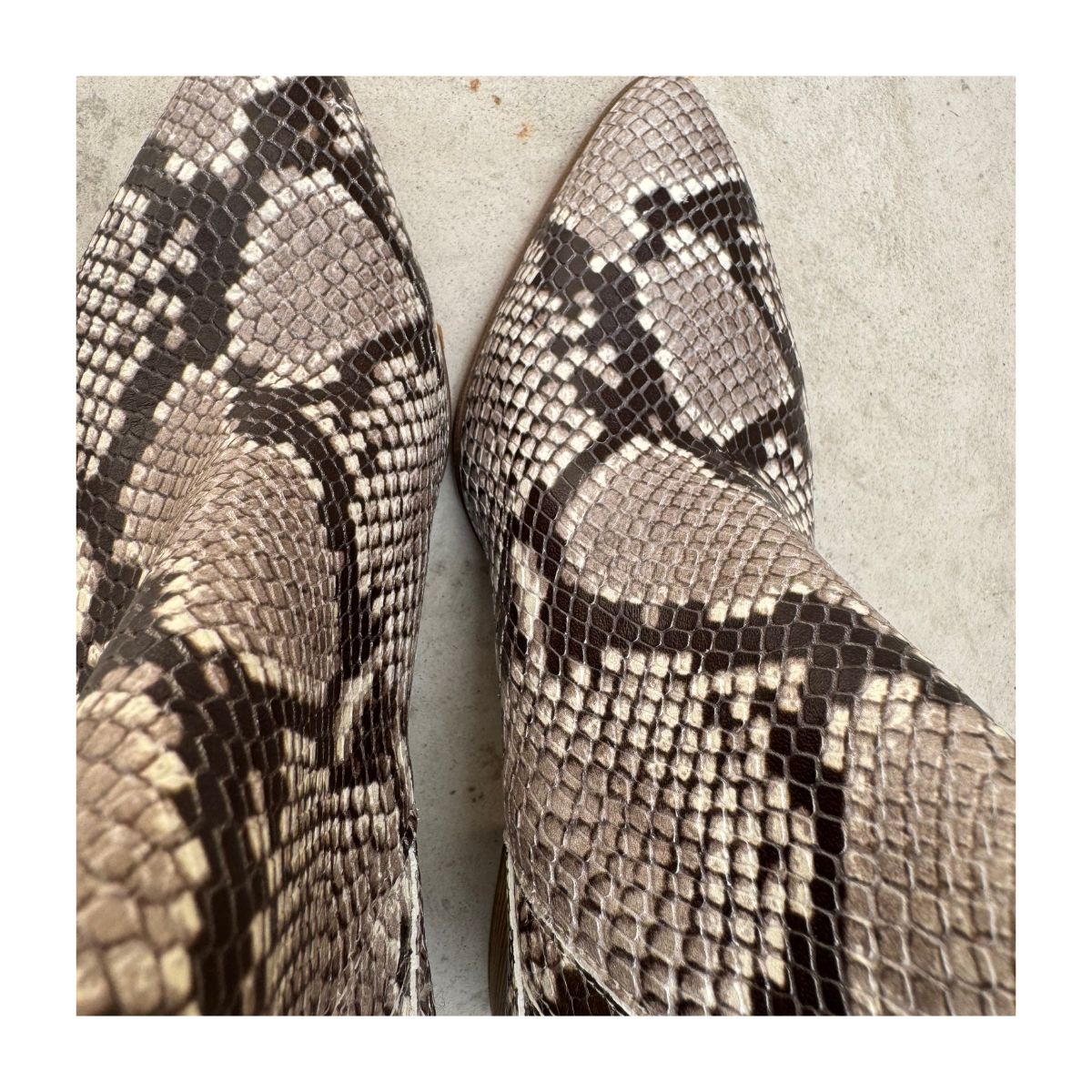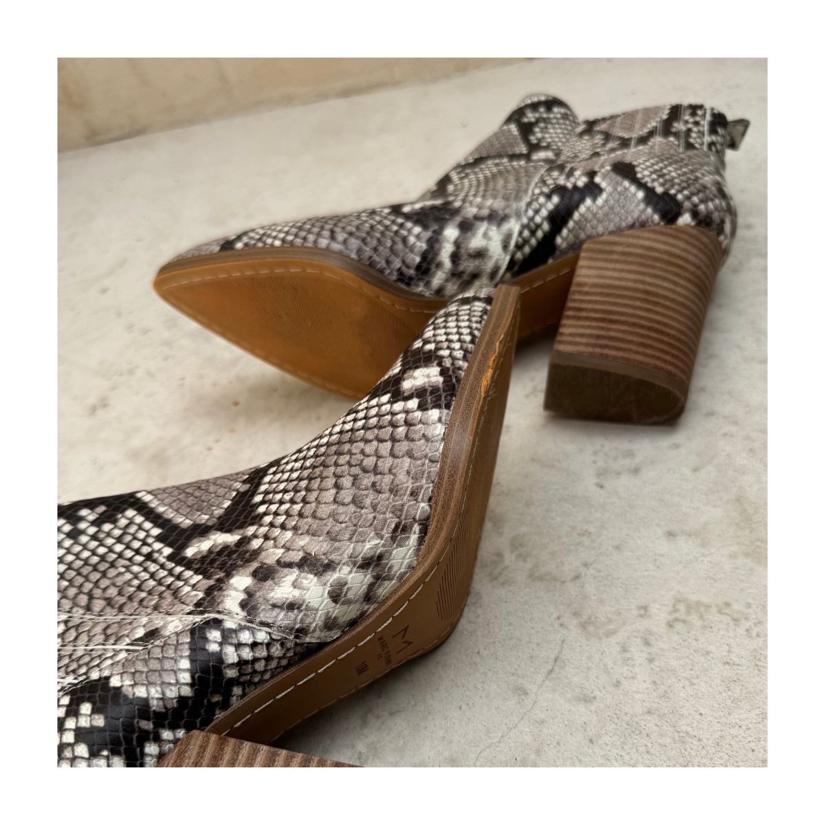 Yale Bootie Marc Fisher El modelo Yale transforma el clásico chelsea boot a través de una piel de pitón que captura la esencia del lujo discreto. Su construcción arquitectónica crea una silueta que fluye desde la punta afilada hasta el tacón apilado artesanal. Los paneles elásticos laterales mantienen la pureza de líneas mientras aportan funcionalidad. La armonía entre el exótico print de pitón y el tacón de madera natural evoca un aire parisino atemporal, fusionando artesanía tradicional con sensibilidad contemporánea.