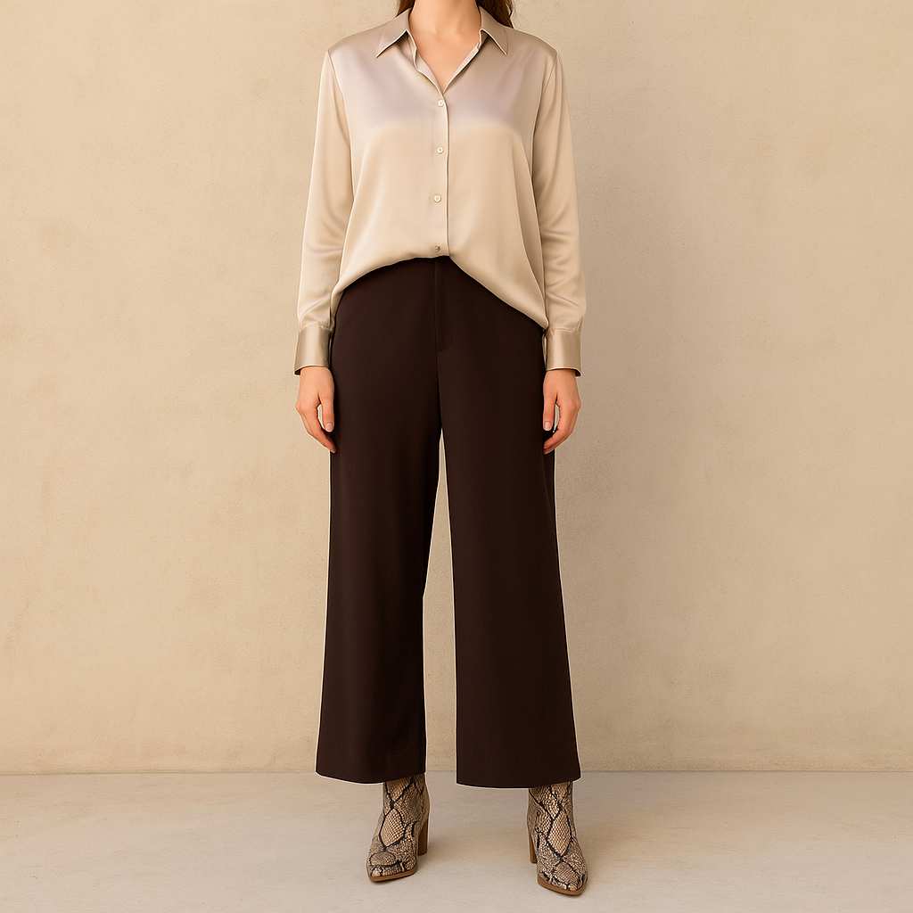 Falda midi plisada en seda salvaje color champagne sobre pantalón recto de lana fría gris perla. Suéter de cachemir oversized con cuello vuelto, abrigo masculino en paño negro. Accesorios: maxi clutch de pitón, pendientes cascada en oro rosa mate, pañuelo de seda Hermès anudado al cuello. Uñas: esmalte gel burgundy oscuro.